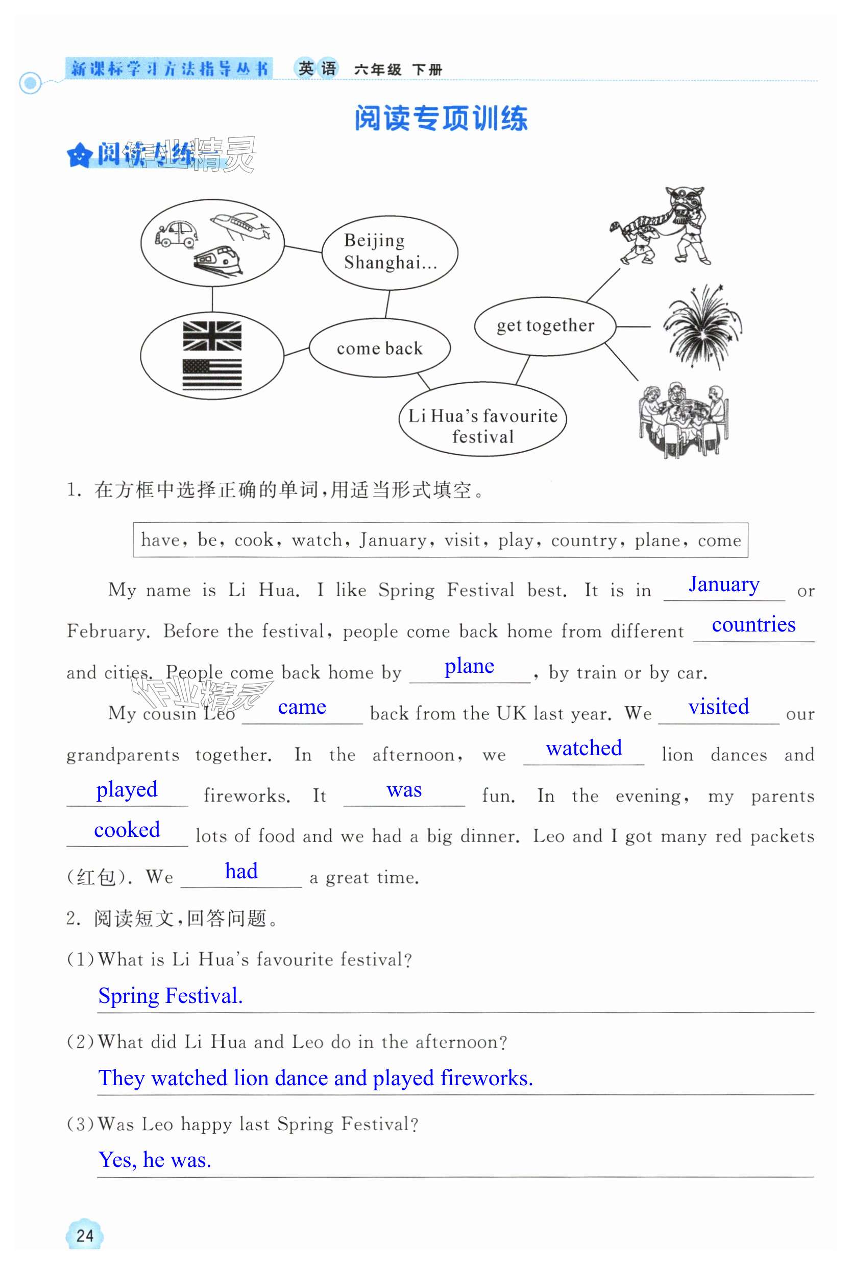注:目前有些书本章节名称可能整理的还不是很完善,但都是按照顺序排列的,请同学们按照顺序仔细查找。练习册 2024年新课标学习方法指导丛书六年级英语下册人教版 答案主要是用来给同学们做完题方便对答案用的,请勿直接抄袭。