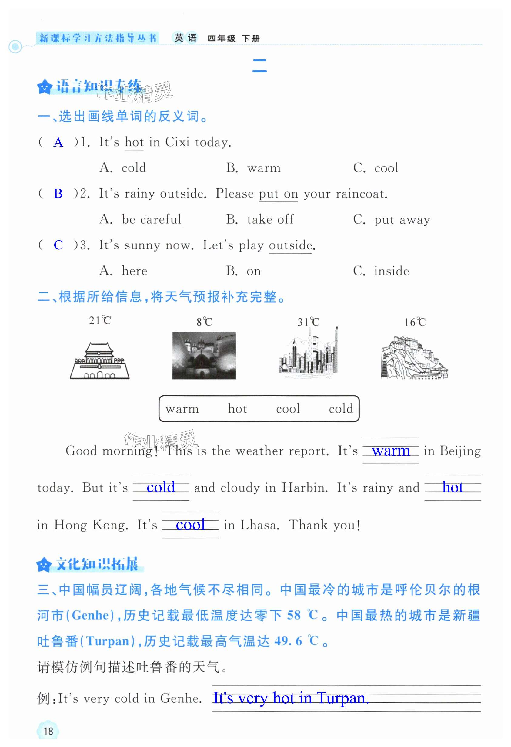 注:目前有些书本章节名称可能整理的还不是很完善,但都是按照顺序排列的,请同学们按照顺序仔细查找。练习册 2024年新课标学习方法指导丛书四年级英语下册人教版 答案主要是用来给同学们做完题方便对答案用的,请勿直接抄袭。