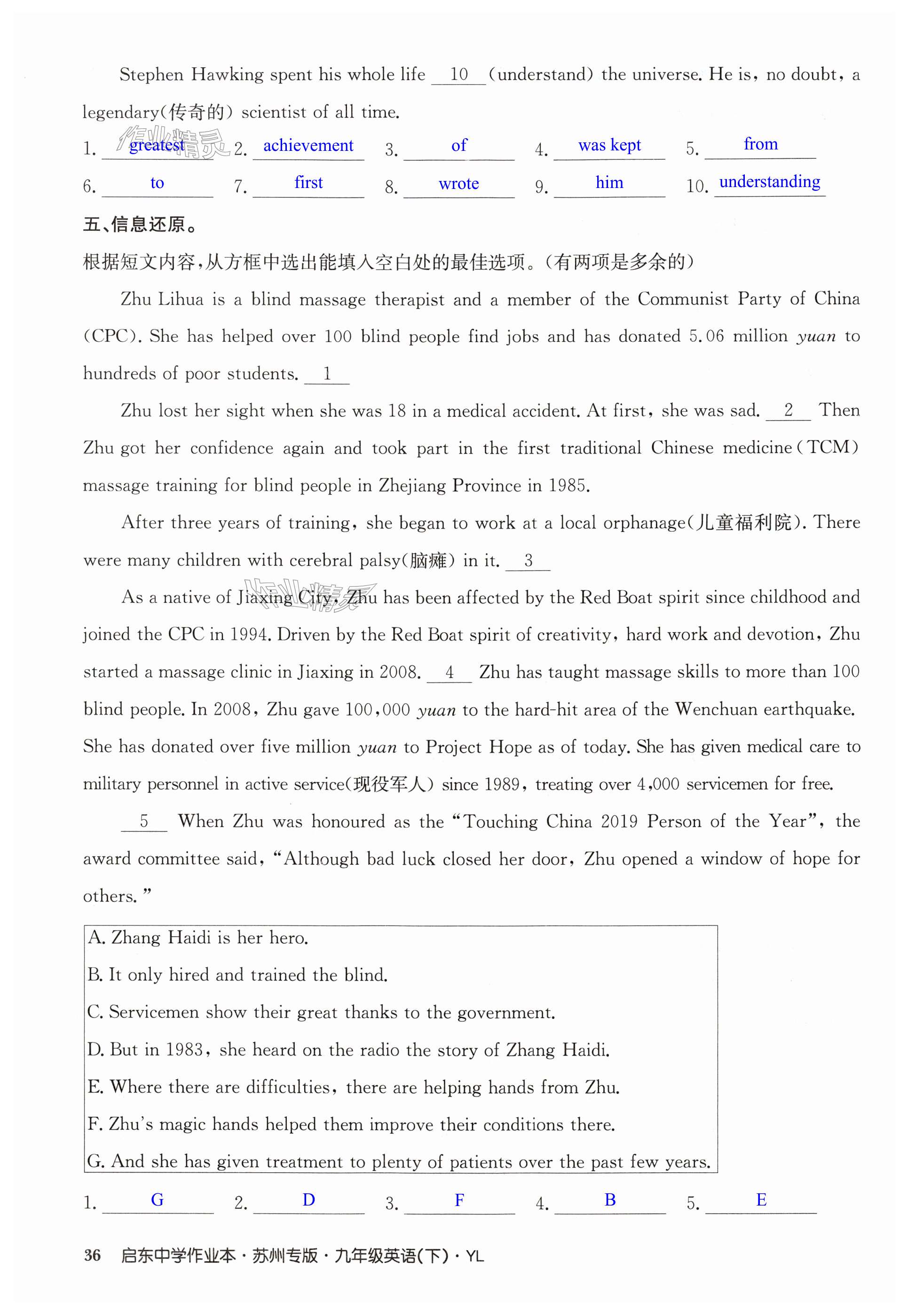 注:目前有些书本章节名称可能整理的还不是很完善,但都是按照顺序排列的,请同学们按照顺序仔细查找。练习册 2024年启东中学作业本九年级英语下册译林版苏州专版 答案主要是用来给同学们做完题方便对答案用的,请勿直接抄袭。