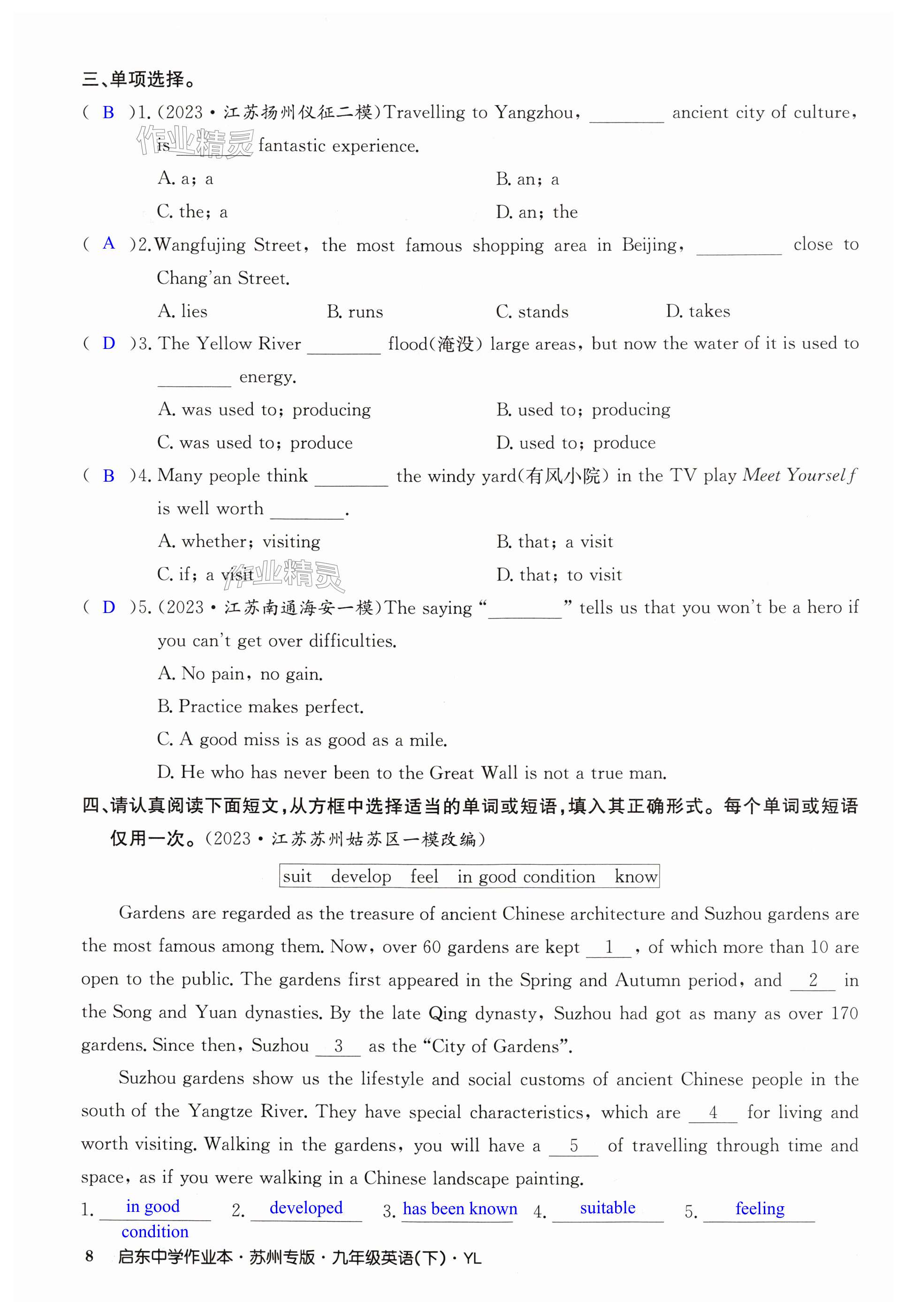 注:目前有些书本章节名称可能整理的还不是很完善,但都是按照顺序排列的,请同学们按照顺序仔细查找。练习册 2024年启东中学作业本九年级英语下册译林版苏州专版 答案主要是用来给同学们做完题方便对答案用的,请勿直接抄袭。