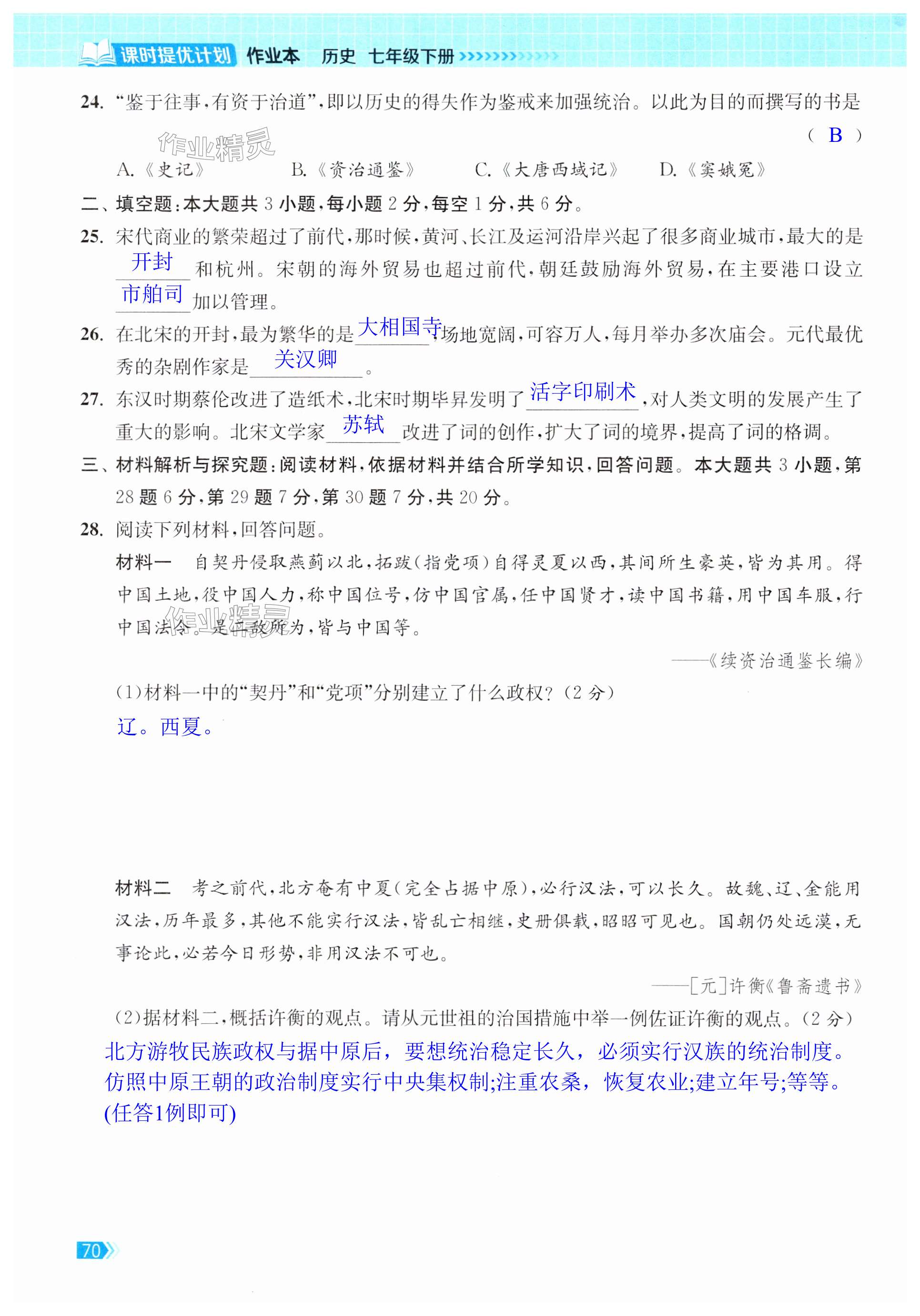 注:目前有些书本章节名称可能整理的还不是很完善,但都是按照顺序排列的,请同学们按照顺序仔细查找。练习册 2024年课时提优计划作业本七年级历史下册人教版 答案主要是用来给同学们做完题方便对答案用的,请勿直接抄袭。
