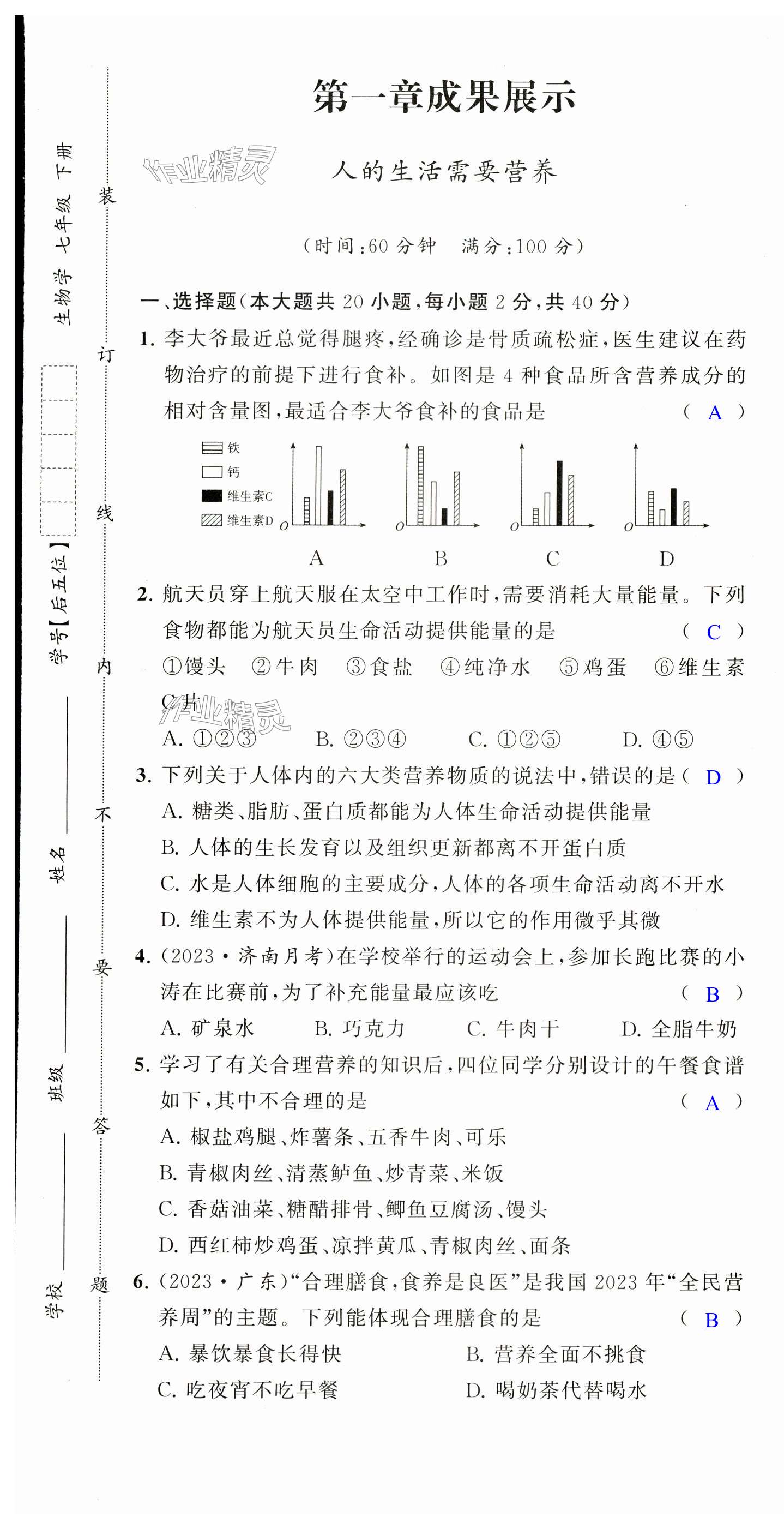 注:目前有些书本章节名称可能整理的还不是很完善,但都是按照顺序排列的,请同学们按照顺序仔细查找。练习册 2024年同步练习册分层卷七年级生物下册济南版 答案主要是用来给同学们做完题方便对答案用的,请勿直接抄袭。