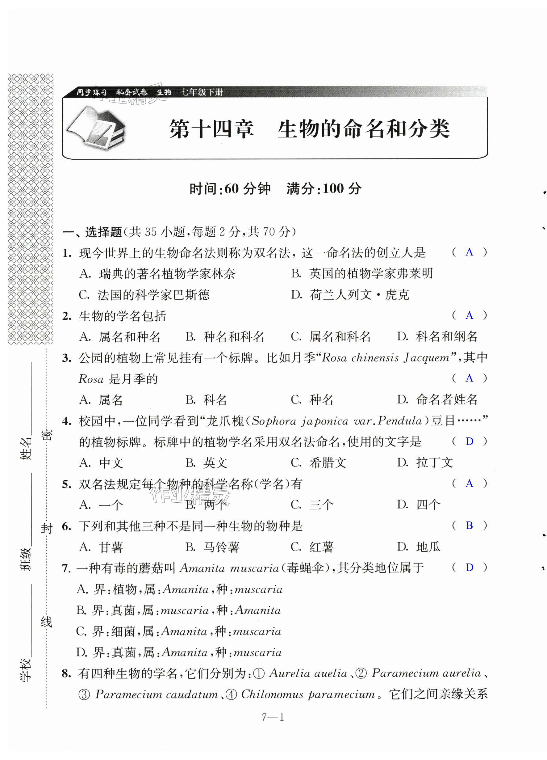注:目前有些书本章节名称可能整理的还不是很完善,但都是按照顺序排列的,请同学们按照顺序仔细查找。练习册 2024年同步练习配套试卷七年级生物下册苏科版 答案主要是用来给同学们做完题方便对答案用的,请勿直接抄袭。