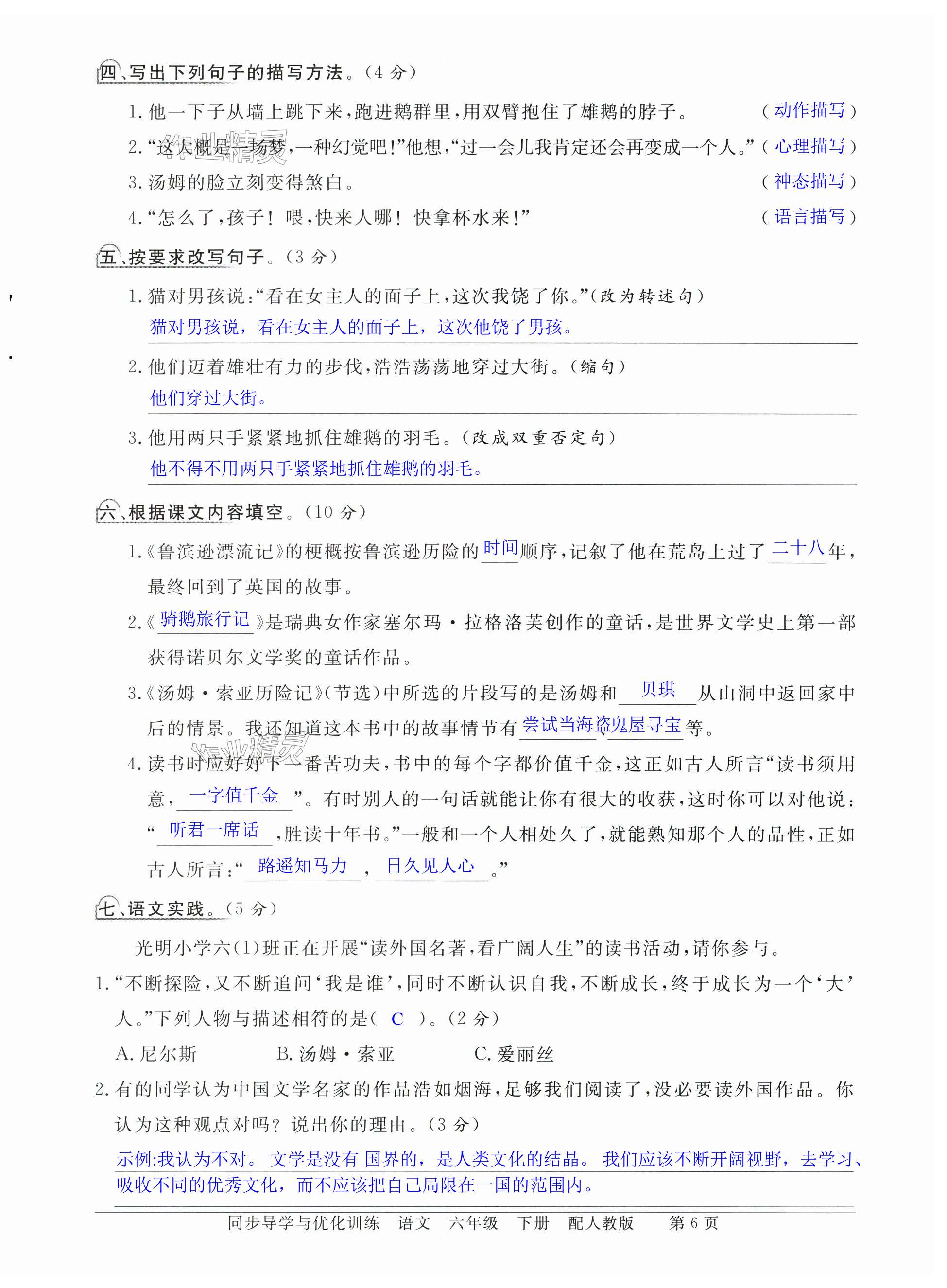 注:目前有些书本章节名称可能整理的还不是很完善,但都是按照顺序排列的,请同学们按照顺序仔细查找。练习册 2024年同步导学与优化训练六年级语文下册人教版 答案主要是用来给同学们做完题方便对答案用的,请勿直接抄袭。
