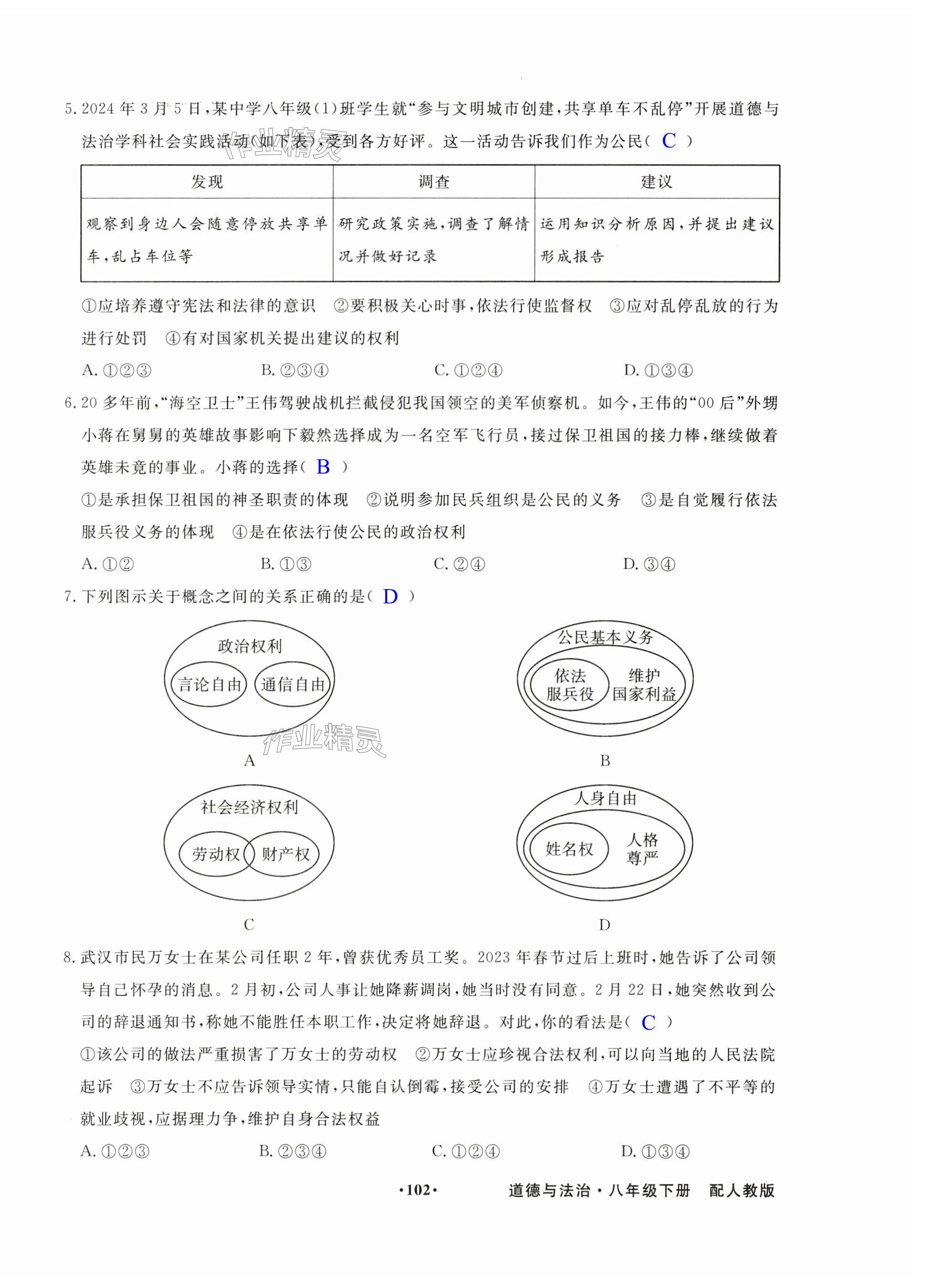 注:目前有些书本章节名称可能整理的还不是很完善,但都是按照顺序排列的,请同学们按照顺序仔细查找。练习册 2024年同步导学与优化训练八年级道德与法治下册人教版 答案主要是用来给同学们做完题方便对答案用的,请勿直接抄袭。