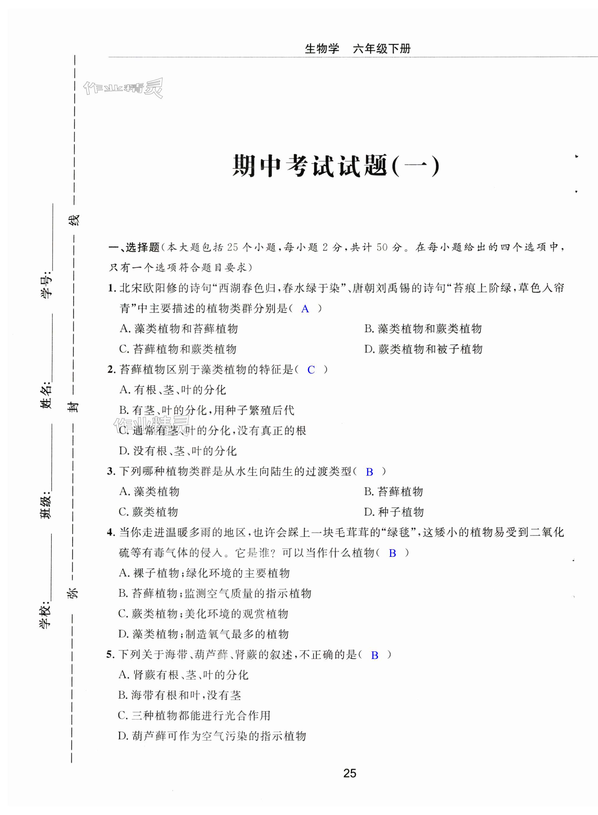 注:目前有些书本章节名称可能整理的还不是很完善,但都是按照顺序排列的,请同学们按照顺序仔细查找。练习册 2024年同步练习册配套检测卷六年级生物下册鲁科版烟台专版54制 答案主要是用来给同学们做完题方便对答案用的,请勿直接抄袭。