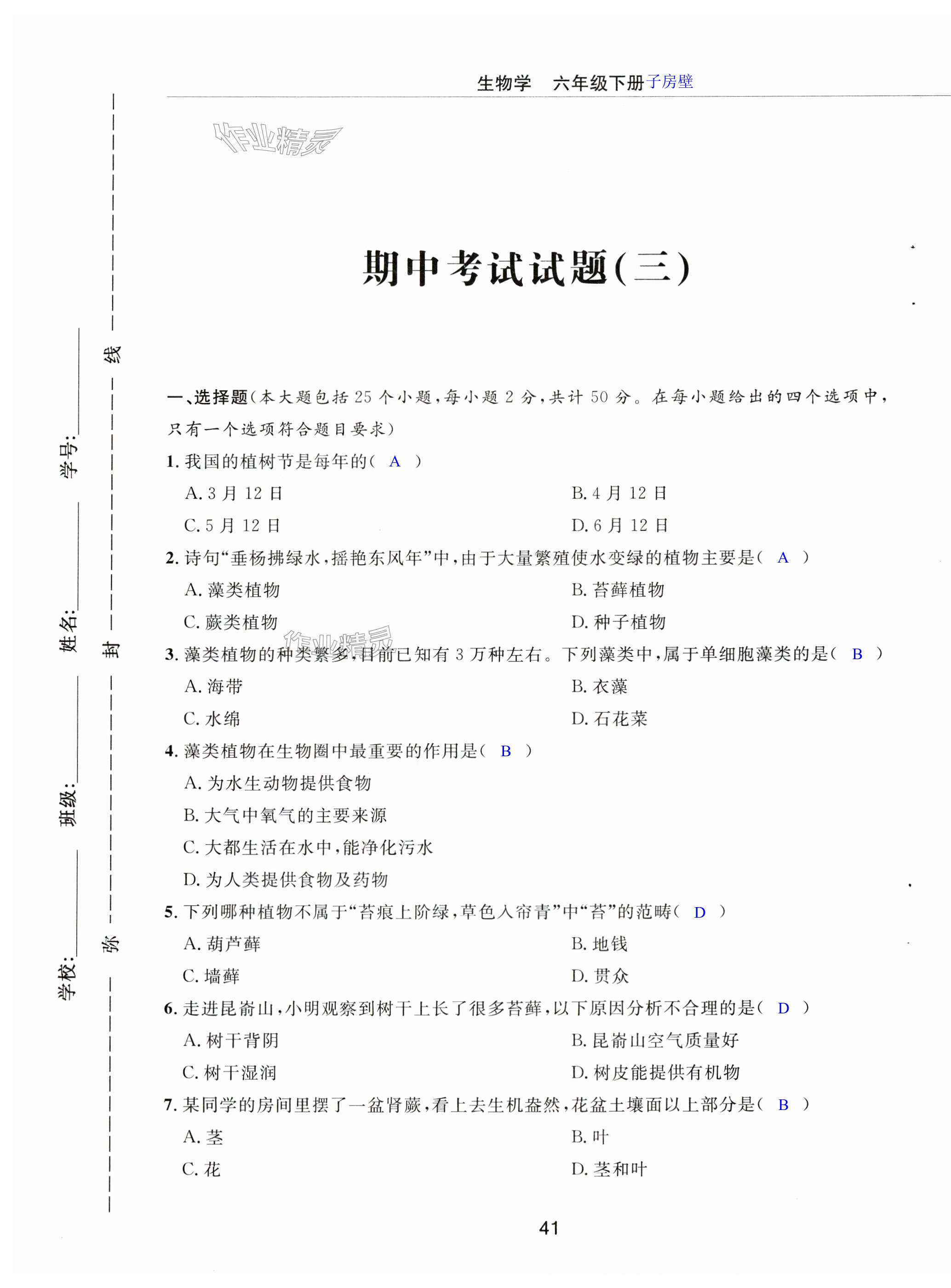 注:目前有些书本章节名称可能整理的还不是很完善,但都是按照顺序排列的,请同学们按照顺序仔细查找。练习册 2024年同步练习册配套检测卷六年级生物下册鲁科版烟台专版54制 答案主要是用来给同学们做完题方便对答案用的,请勿直接抄袭。