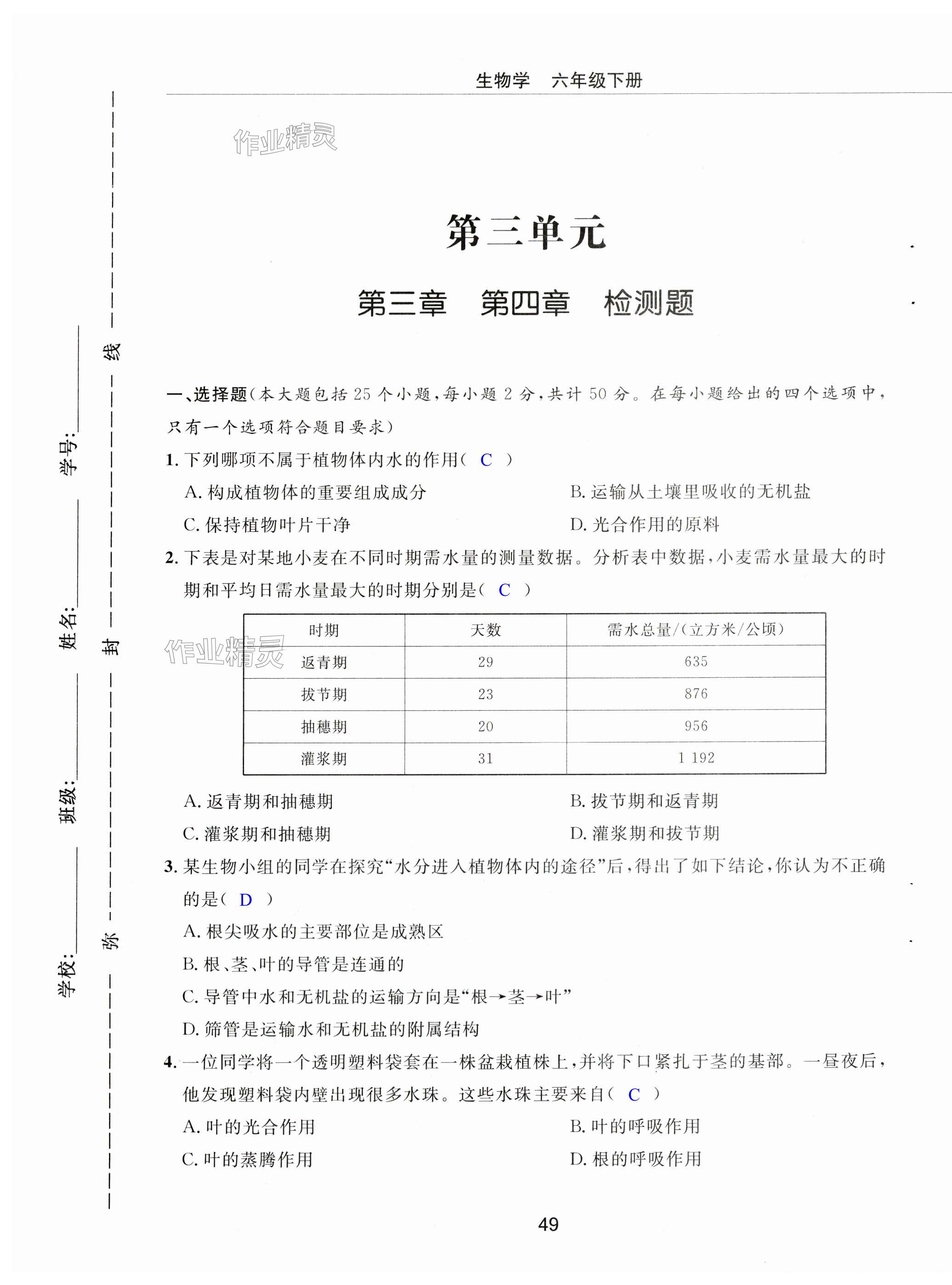 注:目前有些书本章节名称可能整理的还不是很完善,但都是按照顺序排列的,请同学们按照顺序仔细查找。练习册 2024年同步练习册配套检测卷六年级生物下册鲁科版烟台专版54制 答案主要是用来给同学们做完题方便对答案用的,请勿直接抄袭。