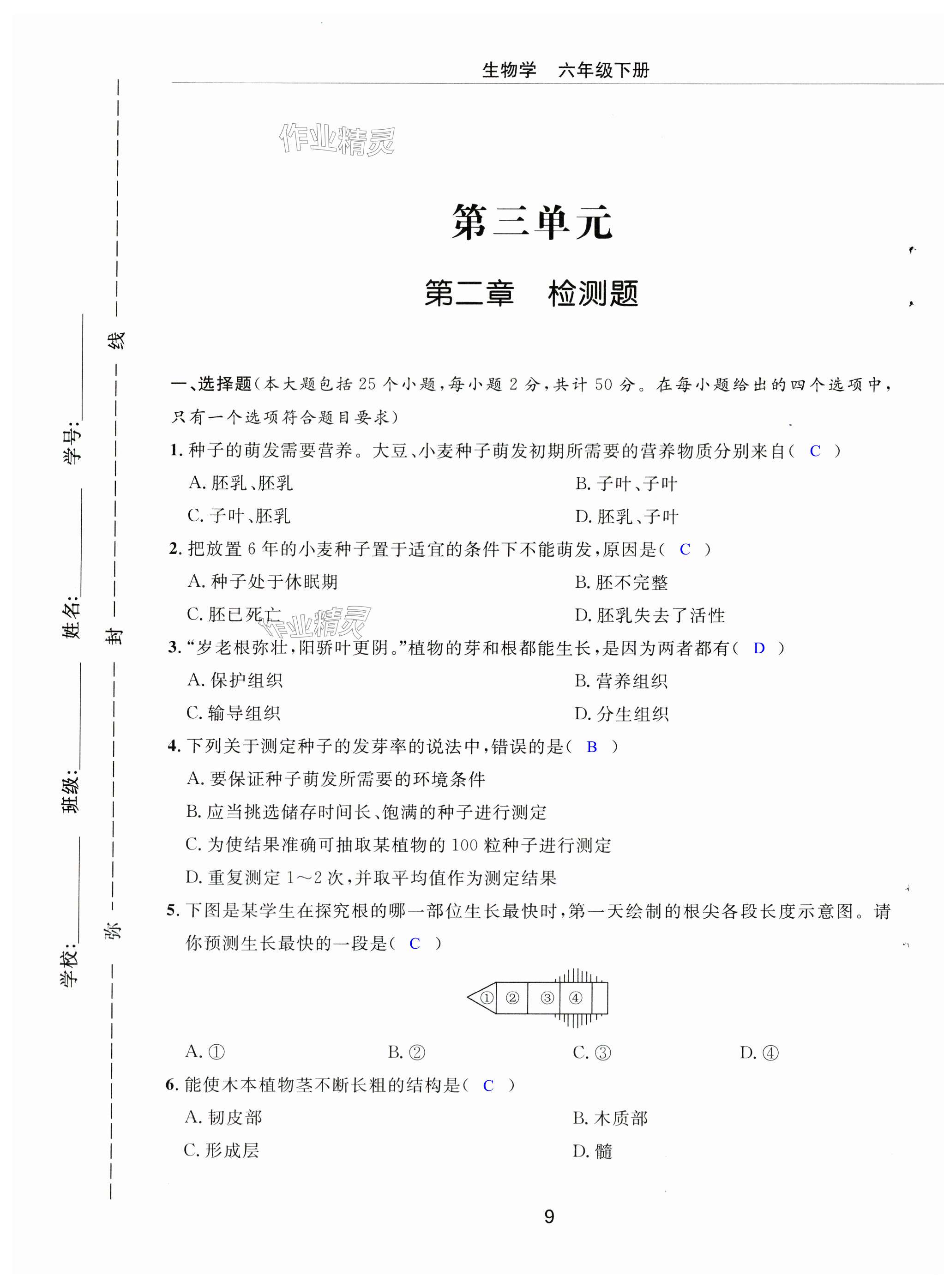 注:目前有些书本章节名称可能整理的还不是很完善,但都是按照顺序排列的,请同学们按照顺序仔细查找。练习册 2024年同步练习册配套检测卷六年级生物下册鲁科版烟台专版54制 答案主要是用来给同学们做完题方便对答案用的,请勿直接抄袭。