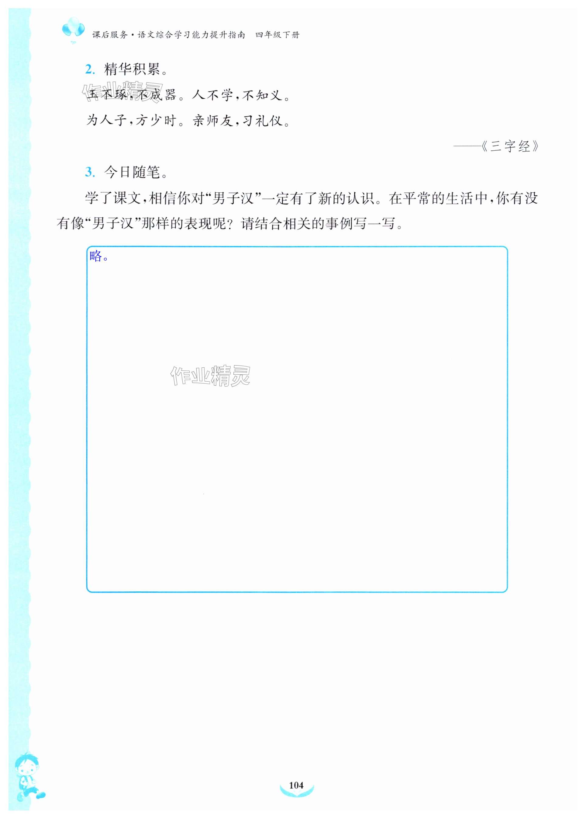 注:目前有些书本章节名称可能整理的还不是很完善,但都是按照顺序排列的,请同学们按照顺序仔细查找。练习册 2024年课后服务综合学习能力提升指南四年级语文下册人教版 答案主要是用来给同学们做完题方便对答案用的,请勿直接抄袭。