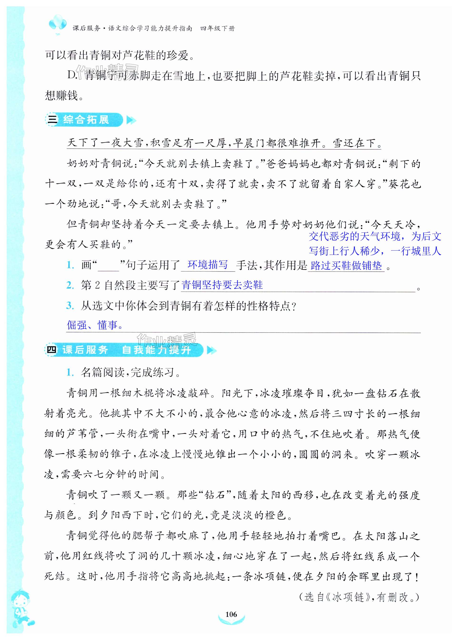注:目前有些书本章节名称可能整理的还不是很完善,但都是按照顺序排列的,请同学们按照顺序仔细查找。练习册 2024年课后服务综合学习能力提升指南四年级语文下册人教版 答案主要是用来给同学们做完题方便对答案用的,请勿直接抄袭。