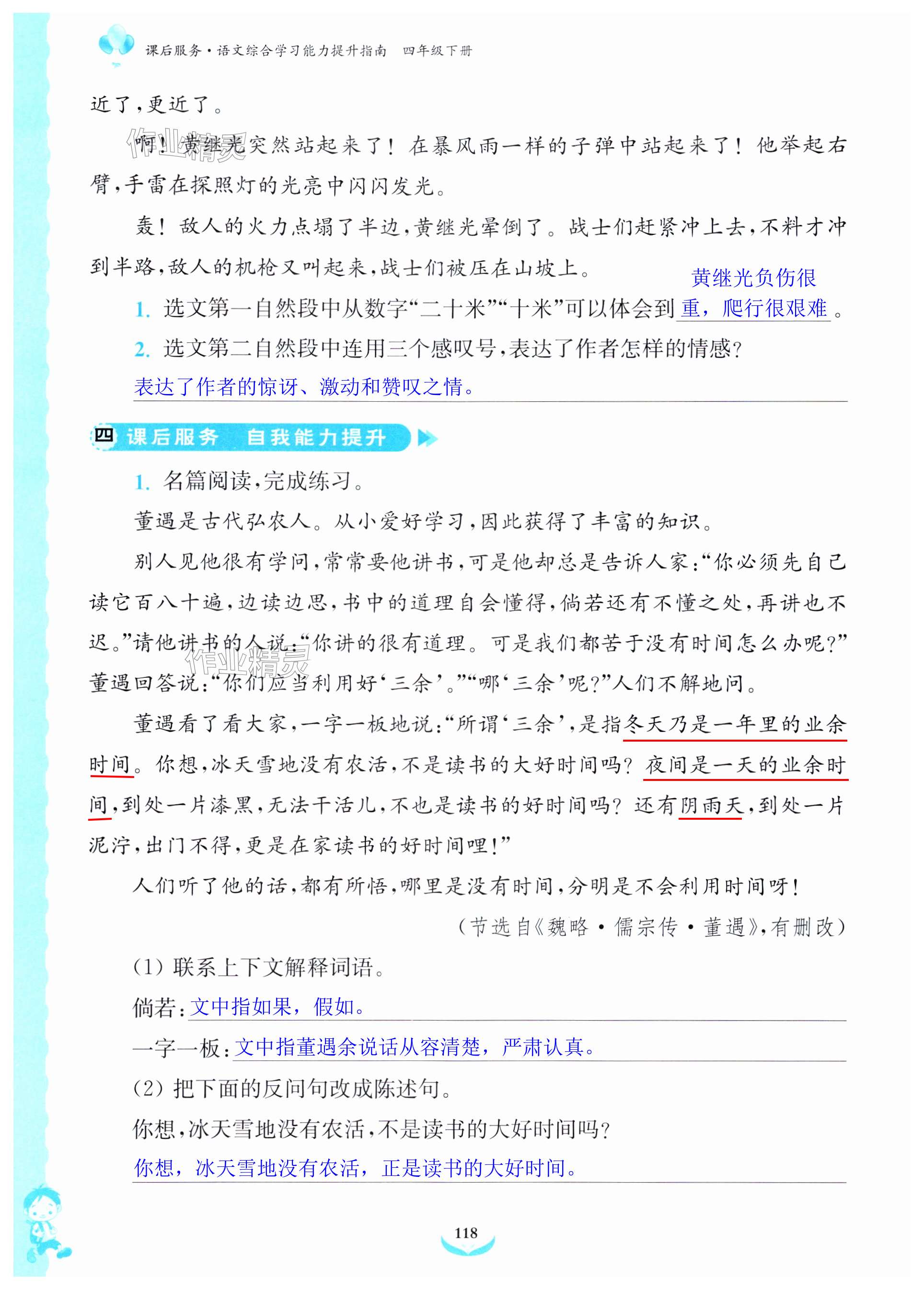注:目前有些书本章节名称可能整理的还不是很完善,但都是按照顺序排列的,请同学们按照顺序仔细查找。练习册 2024年课后服务综合学习能力提升指南四年级语文下册人教版 答案主要是用来给同学们做完题方便对答案用的,请勿直接抄袭。