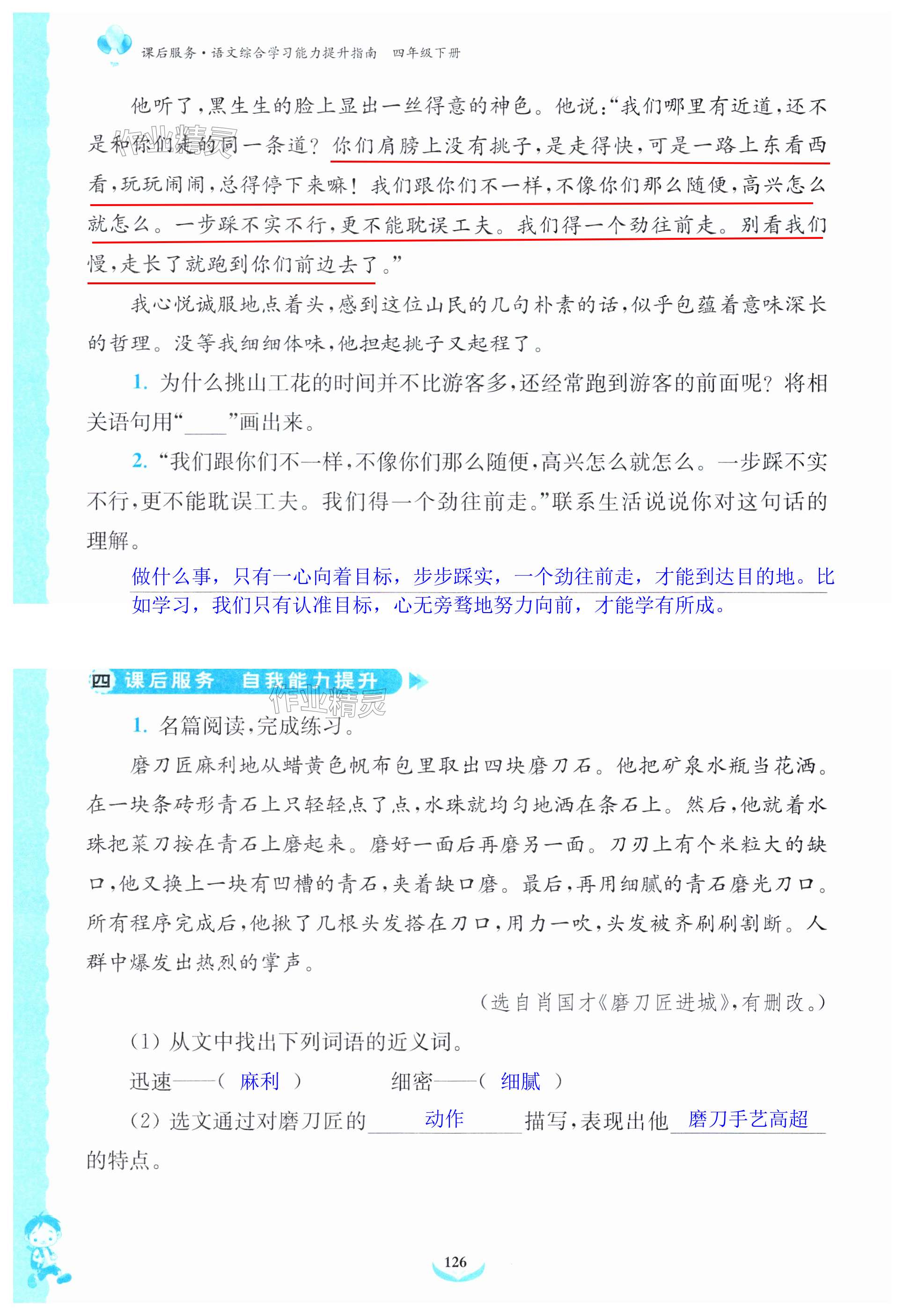 注:目前有些书本章节名称可能整理的还不是很完善,但都是按照顺序排列的,请同学们按照顺序仔细查找。练习册 2024年课后服务综合学习能力提升指南四年级语文下册人教版 答案主要是用来给同学们做完题方便对答案用的,请勿直接抄袭。