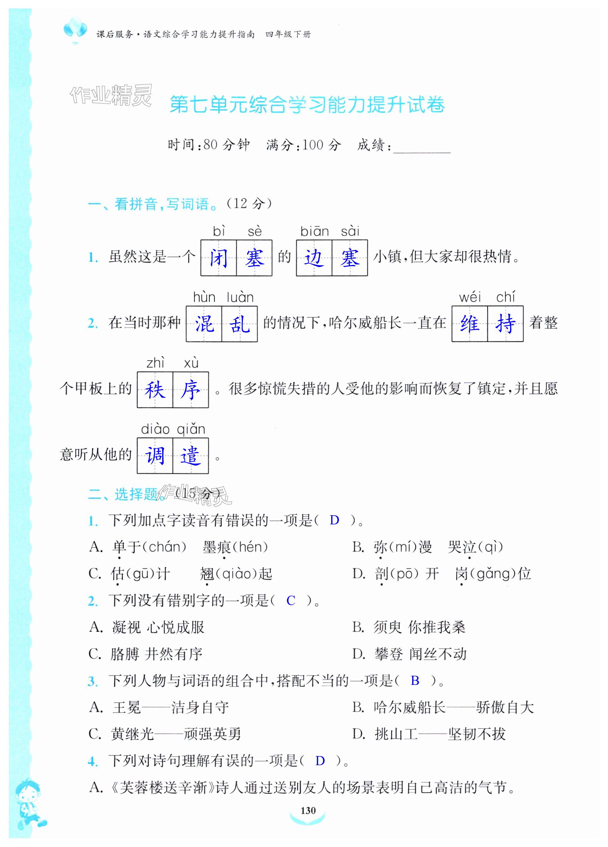 注:目前有些书本章节名称可能整理的还不是很完善,但都是按照顺序排列的,请同学们按照顺序仔细查找。练习册 2024年课后服务综合学习能力提升指南四年级语文下册人教版 答案主要是用来给同学们做完题方便对答案用的,请勿直接抄袭。