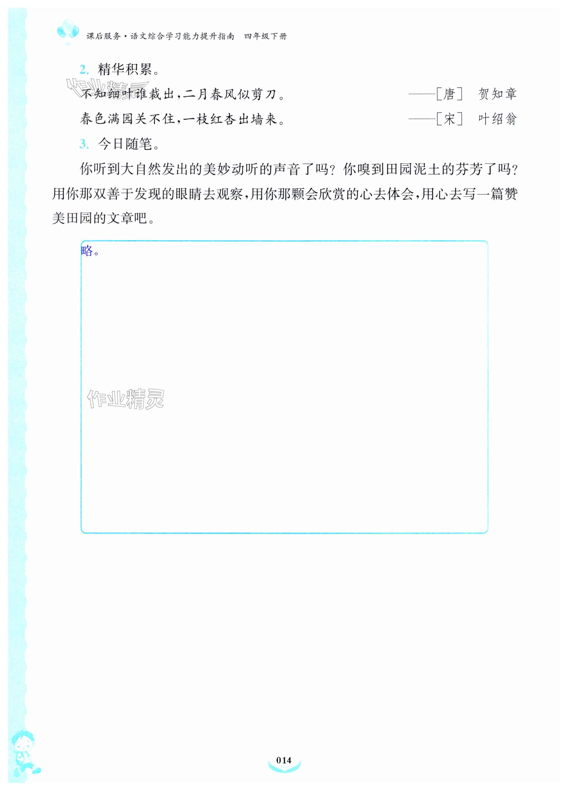 注:目前有些书本章节名称可能整理的还不是很完善,但都是按照顺序排列的,请同学们按照顺序仔细查找。练习册 2024年课后服务综合学习能力提升指南四年级语文下册人教版 答案主要是用来给同学们做完题方便对答案用的,请勿直接抄袭。
