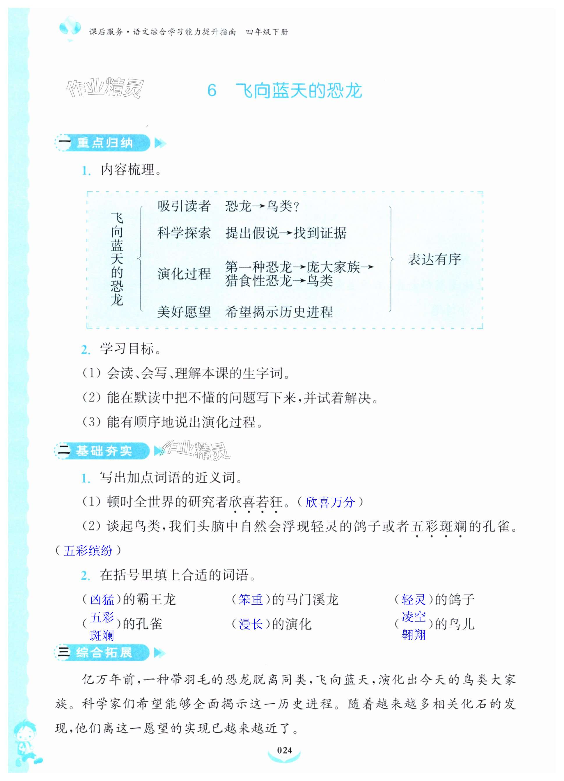 注:目前有些书本章节名称可能整理的还不是很完善,但都是按照顺序排列的,请同学们按照顺序仔细查找。练习册 2024年课后服务综合学习能力提升指南四年级语文下册人教版 答案主要是用来给同学们做完题方便对答案用的,请勿直接抄袭。