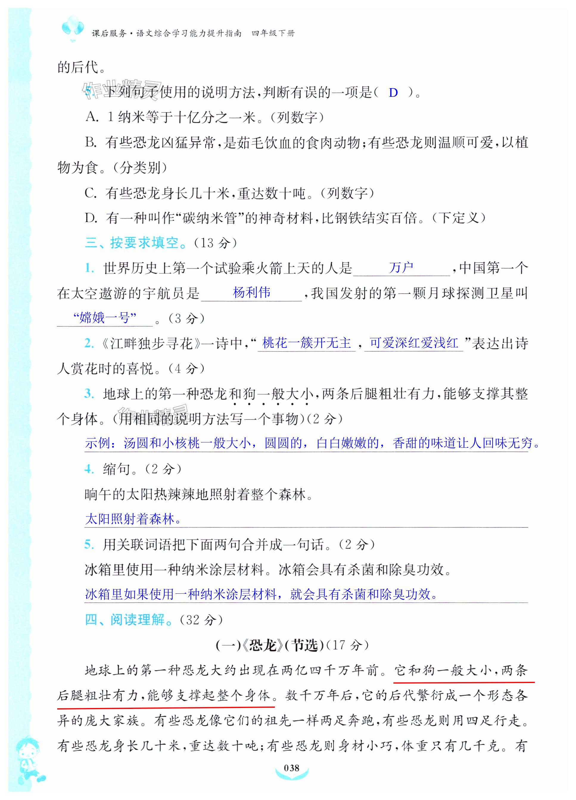 注:目前有些书本章节名称可能整理的还不是很完善,但都是按照顺序排列的,请同学们按照顺序仔细查找。练习册 2024年课后服务综合学习能力提升指南四年级语文下册人教版 答案主要是用来给同学们做完题方便对答案用的,请勿直接抄袭。