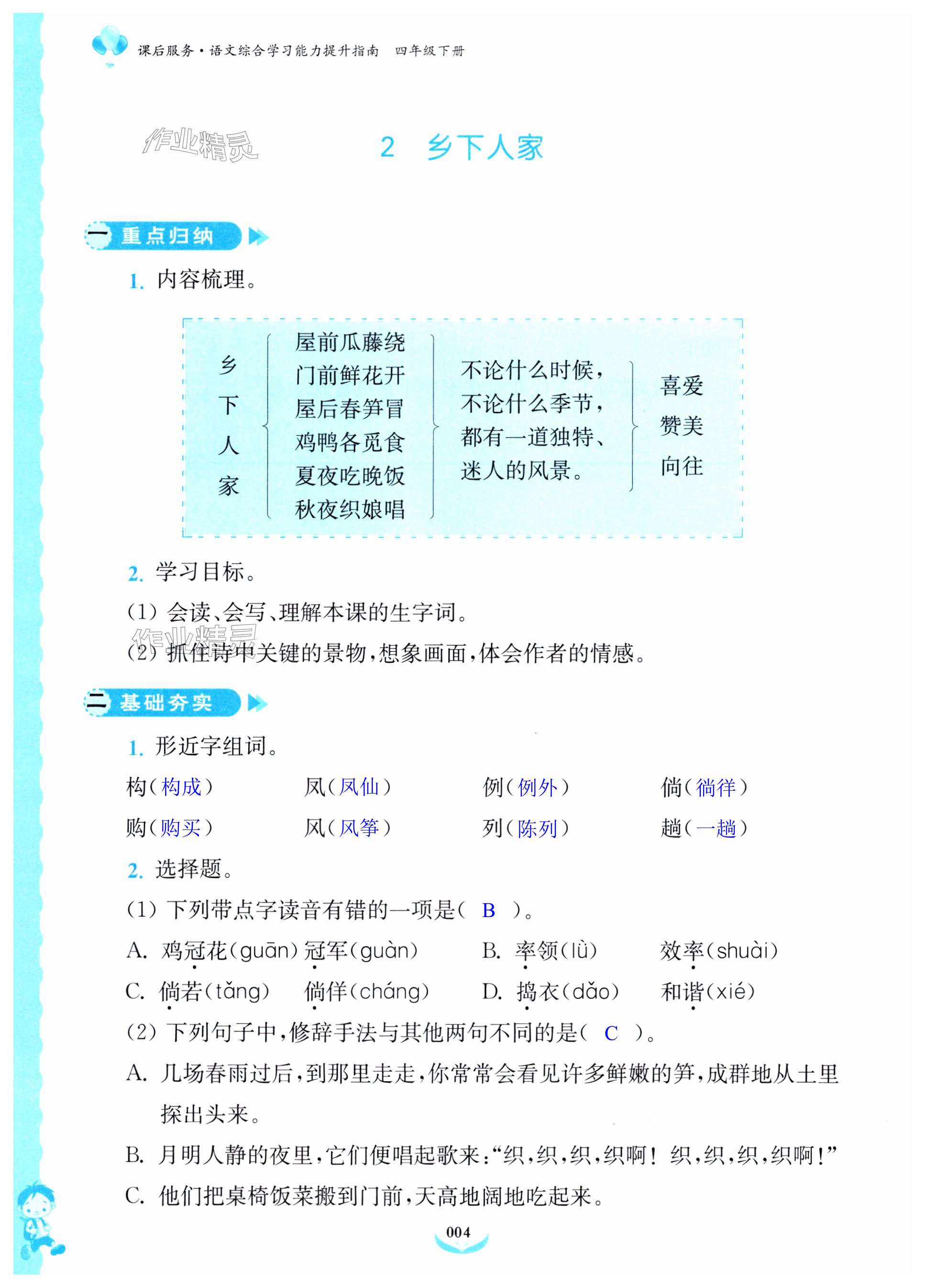注:目前有些书本章节名称可能整理的还不是很完善,但都是按照顺序排列的,请同学们按照顺序仔细查找。练习册 2024年课后服务综合学习能力提升指南四年级语文下册人教版 答案主要是用来给同学们做完题方便对答案用的,请勿直接抄袭。
