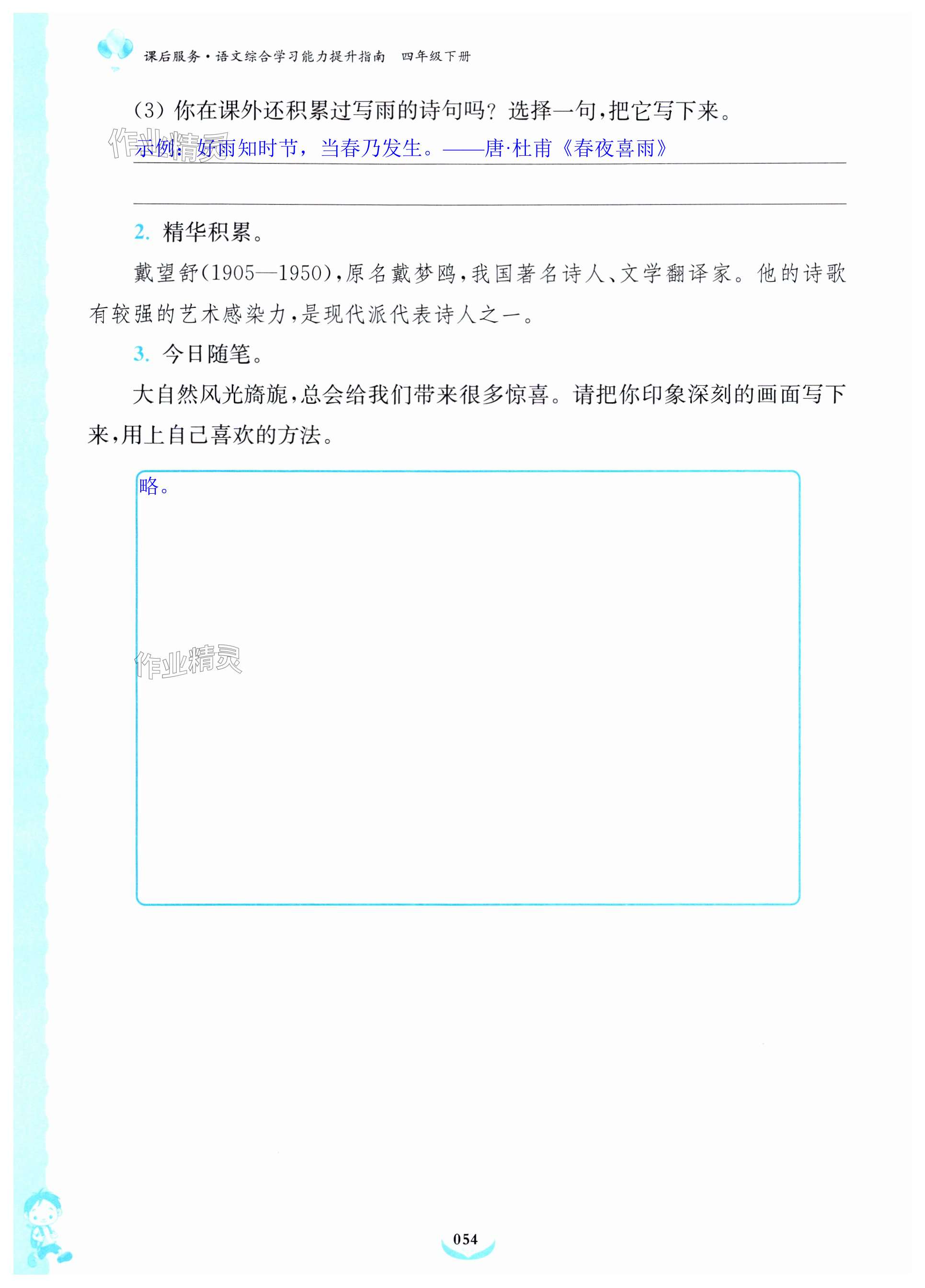 注:目前有些书本章节名称可能整理的还不是很完善,但都是按照顺序排列的,请同学们按照顺序仔细查找。练习册 2024年课后服务综合学习能力提升指南四年级语文下册人教版 答案主要是用来给同学们做完题方便对答案用的,请勿直接抄袭。