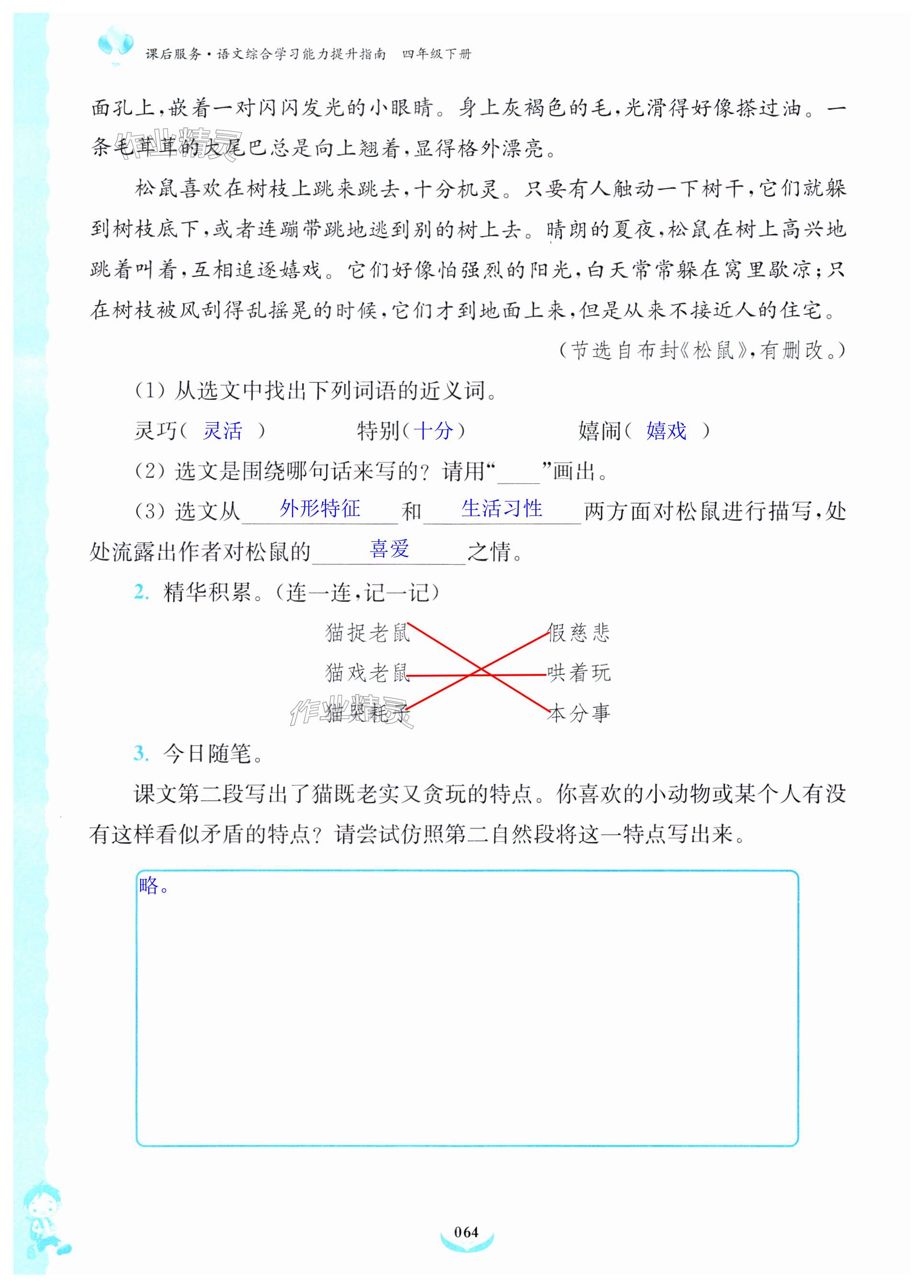 注:目前有些书本章节名称可能整理的还不是很完善,但都是按照顺序排列的,请同学们按照顺序仔细查找。练习册 2024年课后服务综合学习能力提升指南四年级语文下册人教版 答案主要是用来给同学们做完题方便对答案用的,请勿直接抄袭。