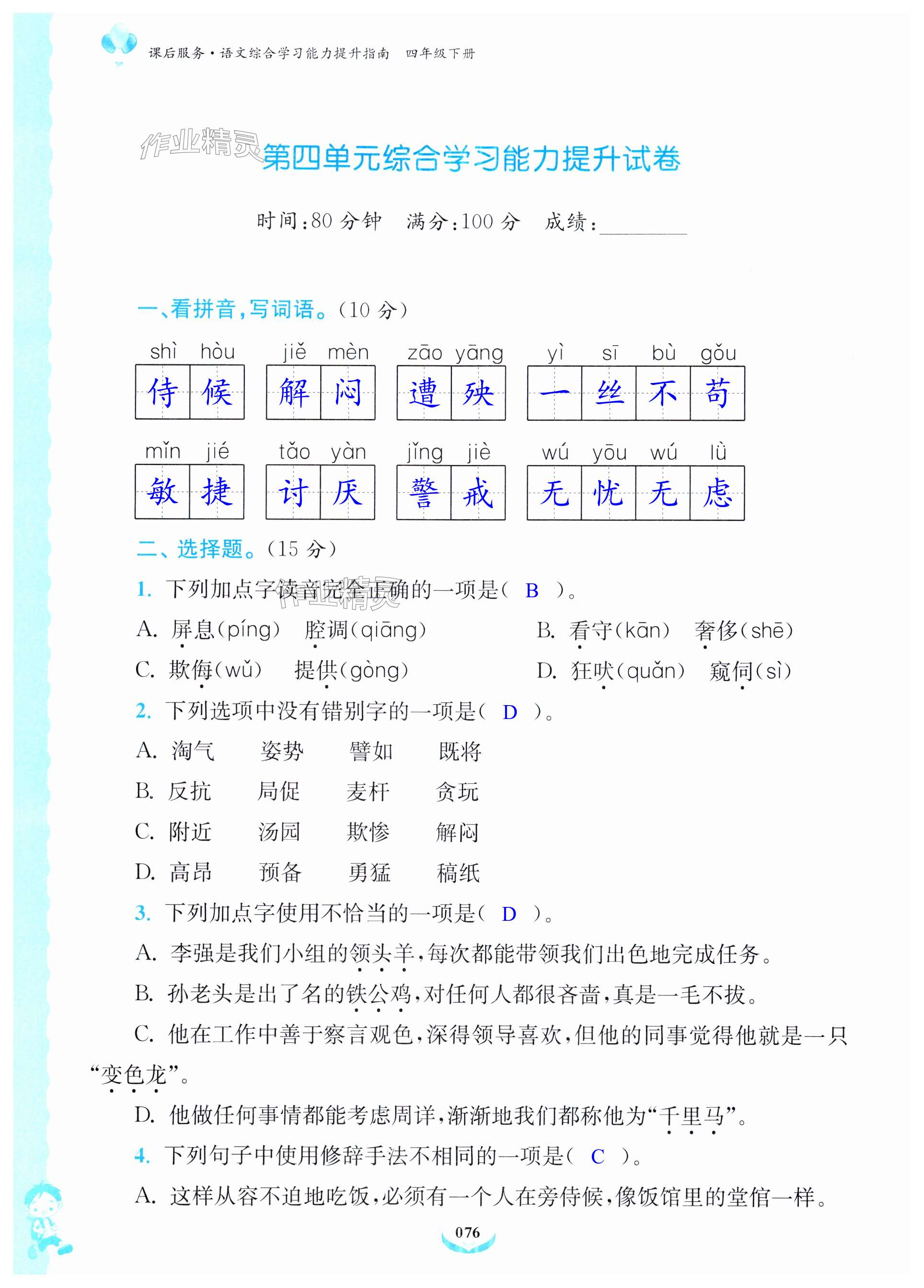注:目前有些书本章节名称可能整理的还不是很完善,但都是按照顺序排列的,请同学们按照顺序仔细查找。练习册 2024年课后服务综合学习能力提升指南四年级语文下册人教版 答案主要是用来给同学们做完题方便对答案用的,请勿直接抄袭。
