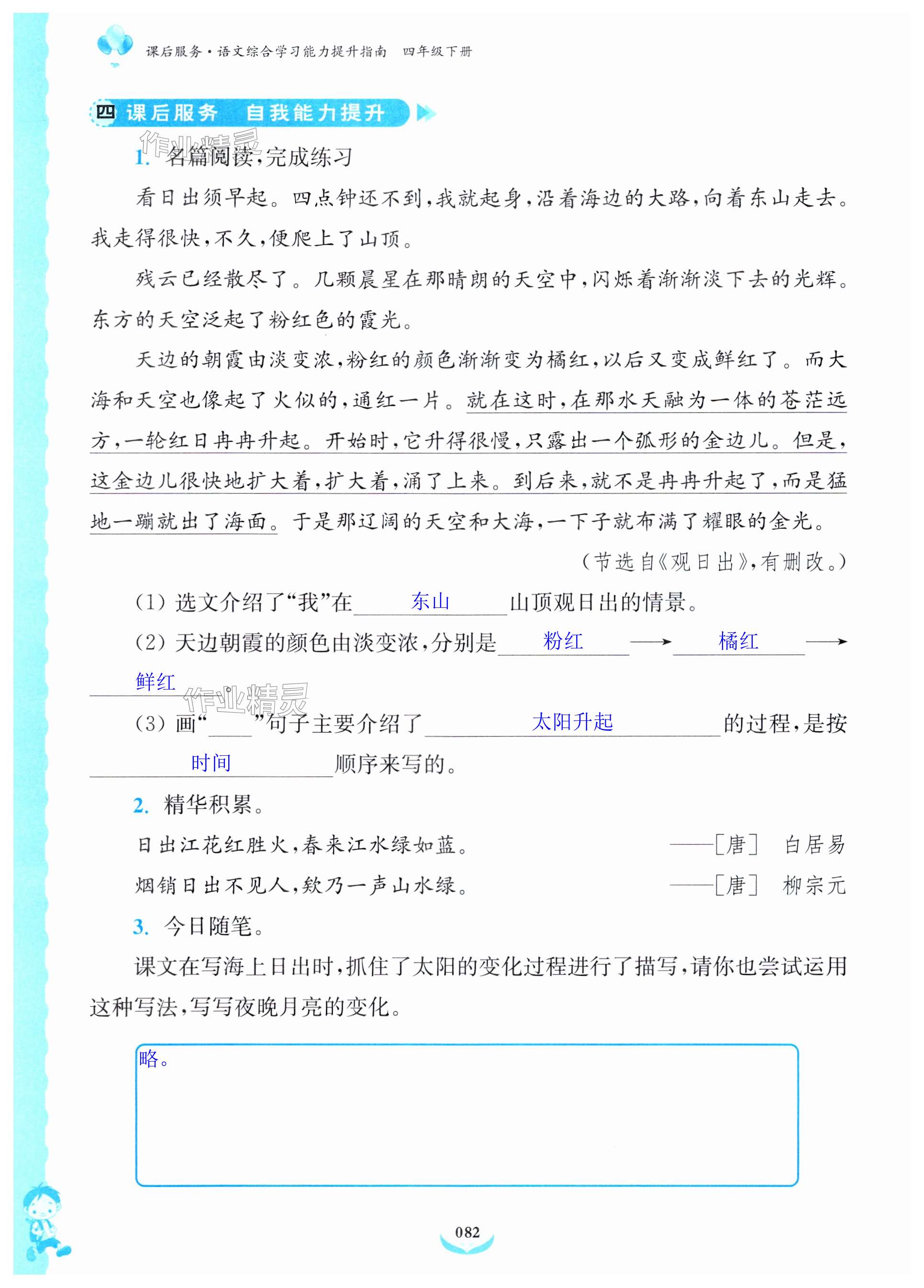 注:目前有些书本章节名称可能整理的还不是很完善,但都是按照顺序排列的,请同学们按照顺序仔细查找。练习册 2024年课后服务综合学习能力提升指南四年级语文下册人教版 答案主要是用来给同学们做完题方便对答案用的,请勿直接抄袭。
