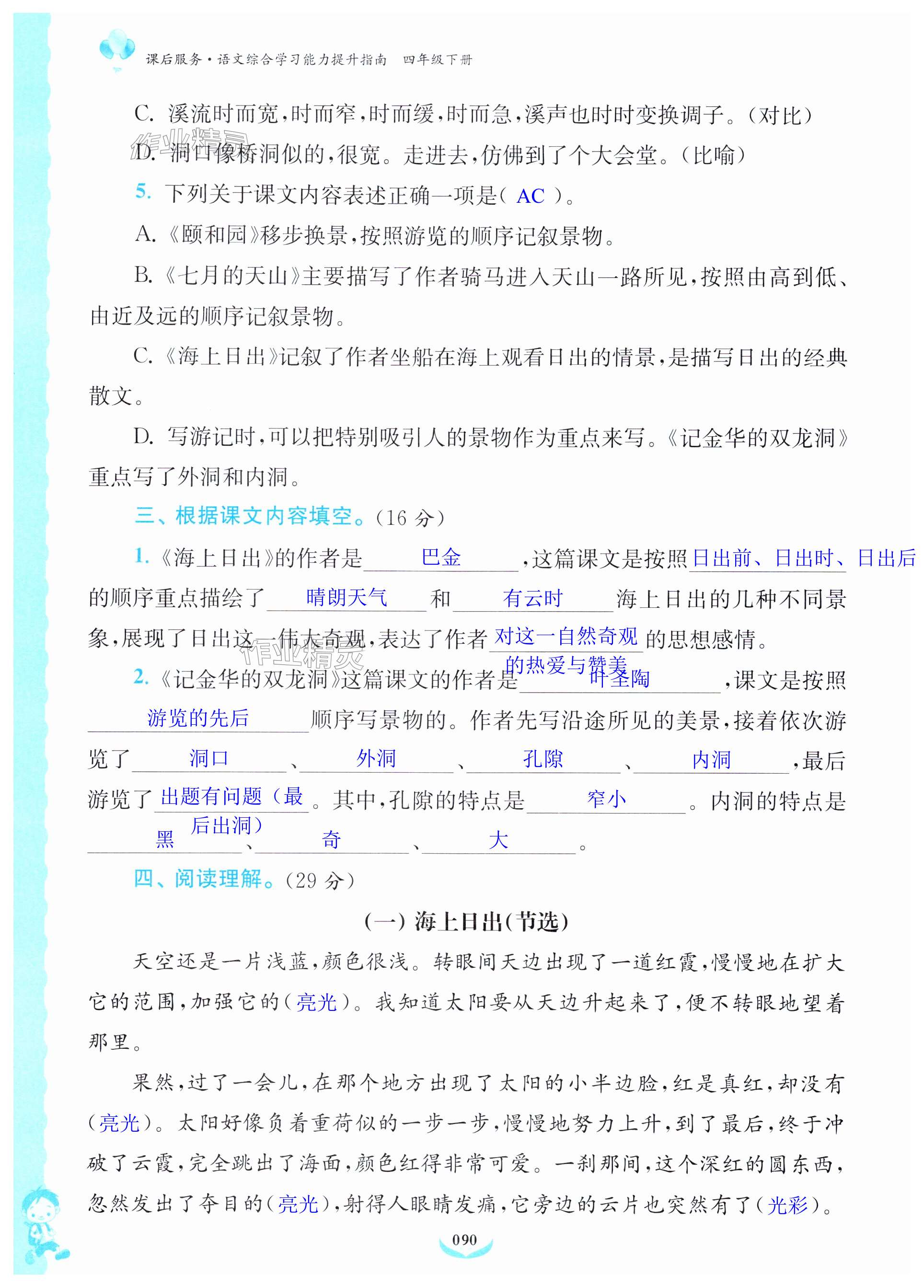 注:目前有些书本章节名称可能整理的还不是很完善,但都是按照顺序排列的,请同学们按照顺序仔细查找。练习册 2024年课后服务综合学习能力提升指南四年级语文下册人教版 答案主要是用来给同学们做完题方便对答案用的,请勿直接抄袭。