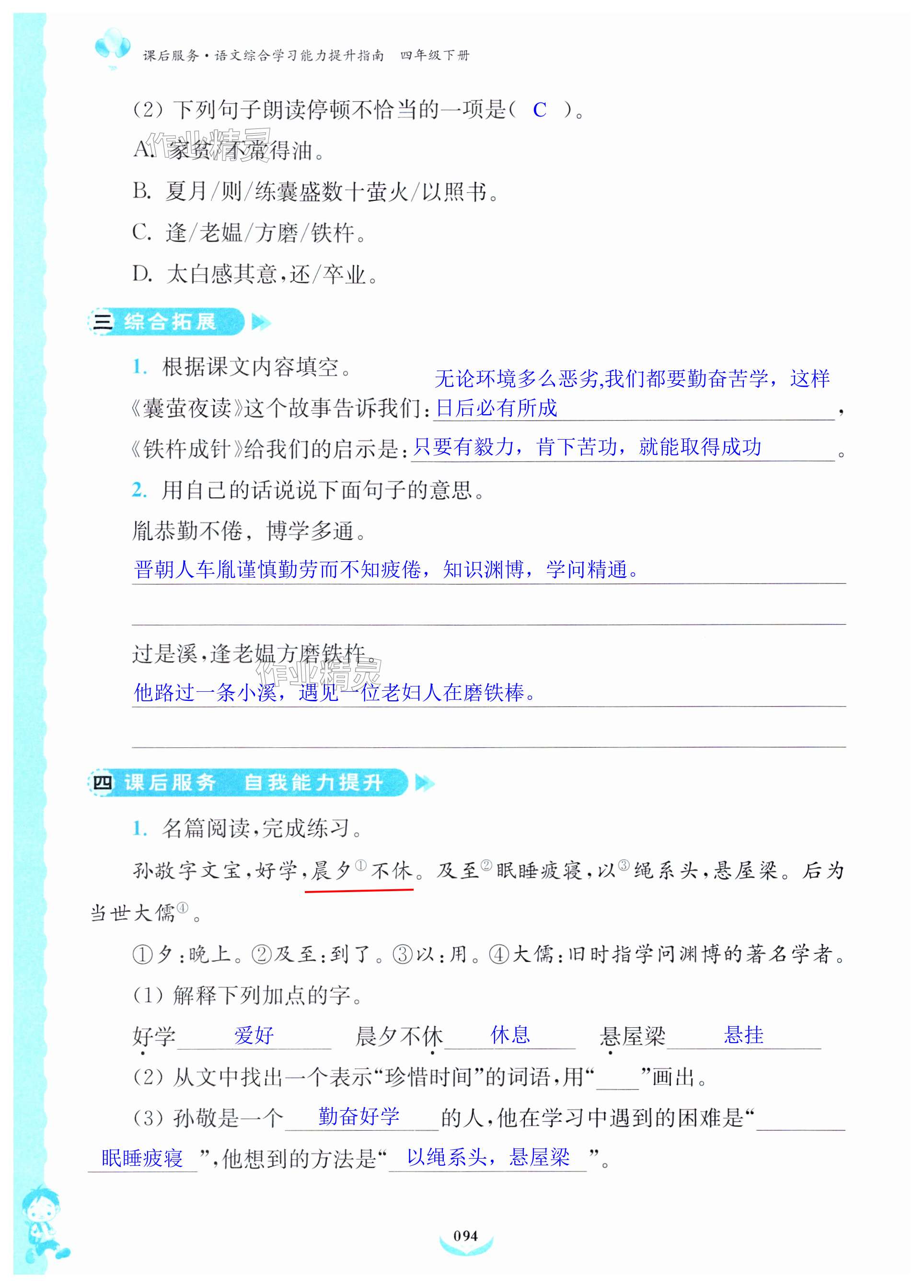 注:目前有些书本章节名称可能整理的还不是很完善,但都是按照顺序排列的,请同学们按照顺序仔细查找。练习册 2024年课后服务综合学习能力提升指南四年级语文下册人教版 答案主要是用来给同学们做完题方便对答案用的,请勿直接抄袭。