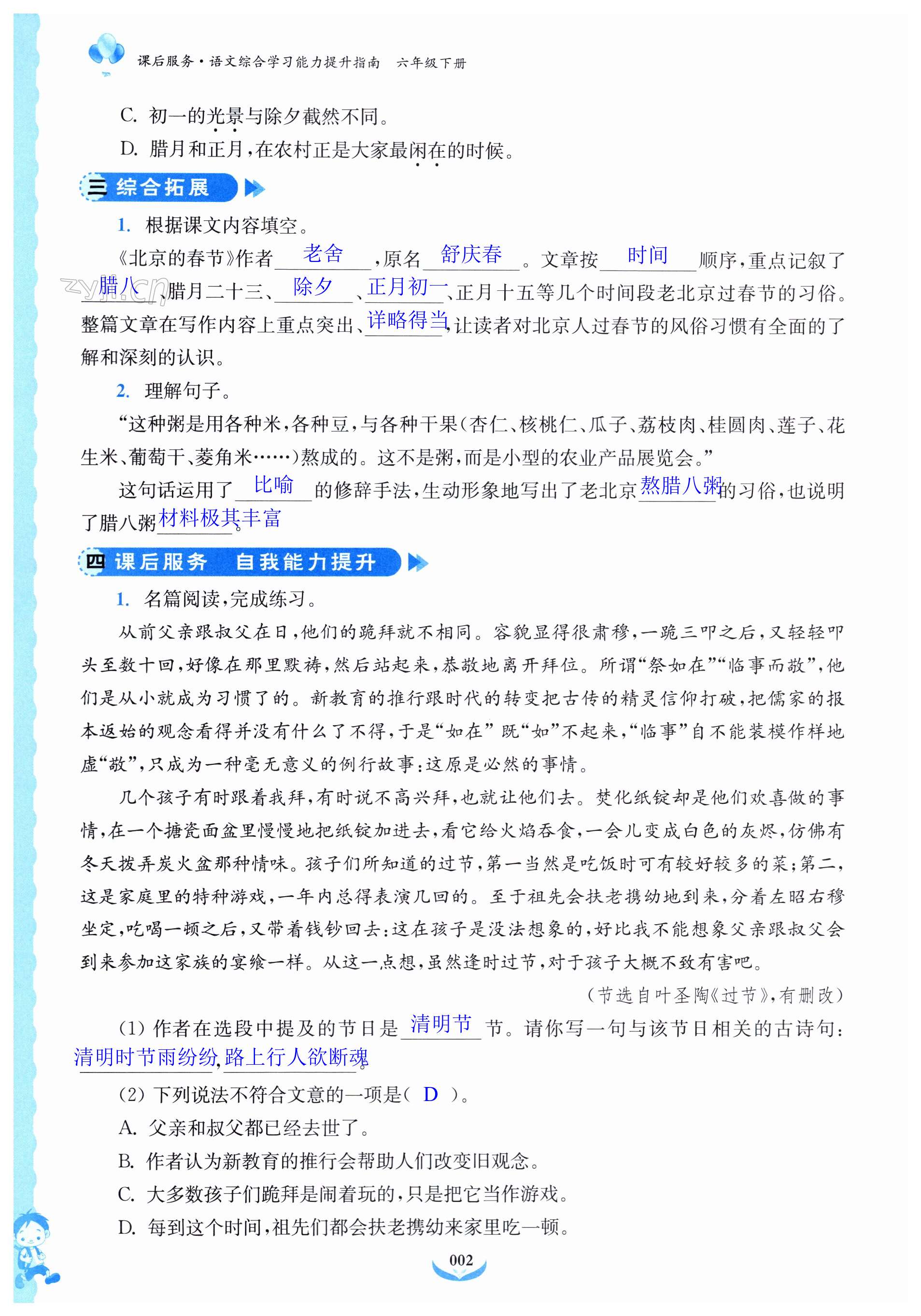 注:目前有些书本章节名称可能整理的还不是很完善,但都是按照顺序排列的,请同学们按照顺序仔细查找。练习册 2024年课后服务综合学习能力提升指南六年级语文下册人教版 答案主要是用来给同学们做完题方便对答案用的,请勿直接抄袭。