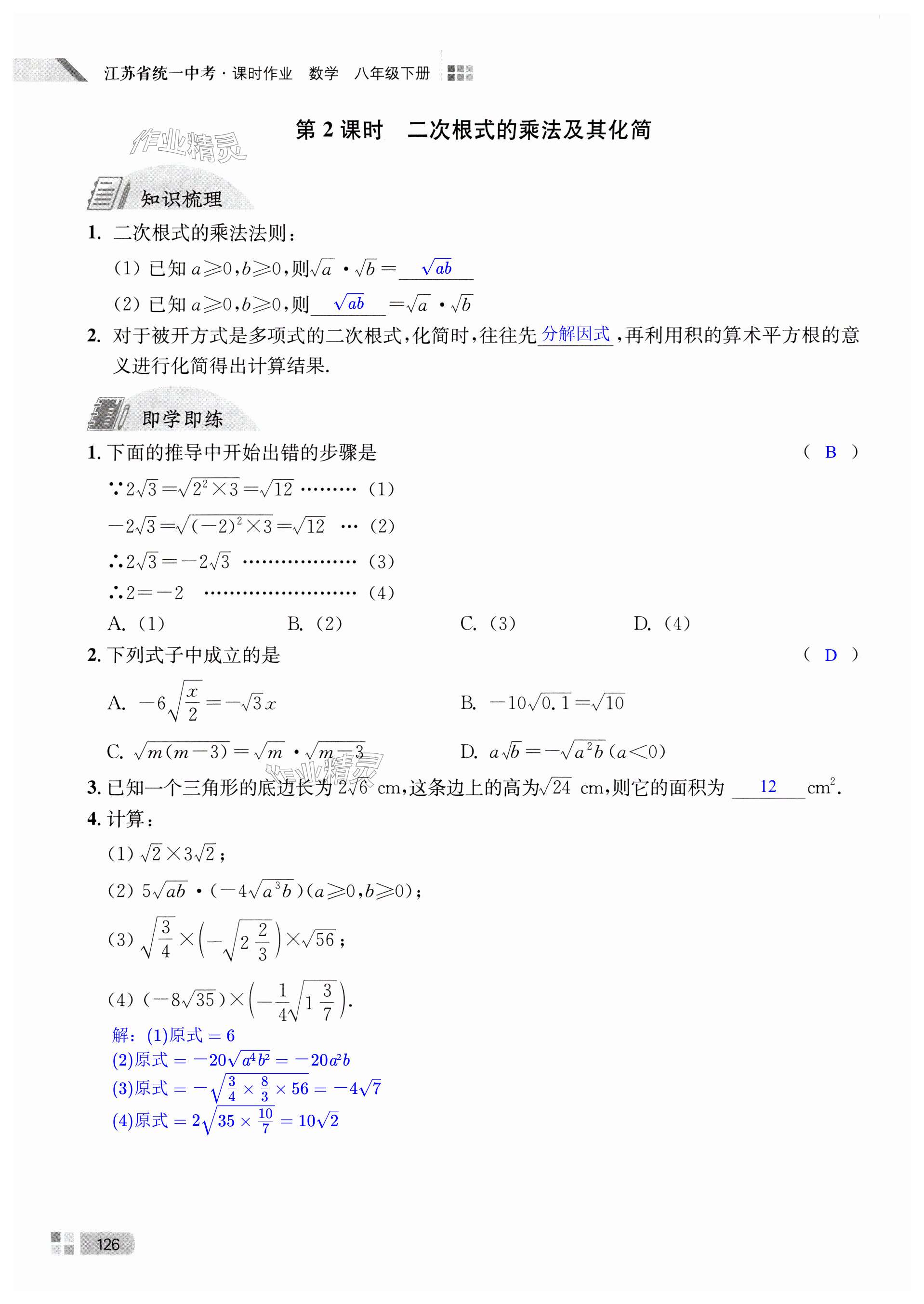 注:目前有些书本章节名称可能整理的还不是很完善,但都是按照顺序排列的,请同学们按照顺序仔细查找。练习册 2024年江苏省统一中考课时作业八年级数学下册苏科版 答案主要是用来给同学们做完题方便对答案用的,请勿直接抄袭。