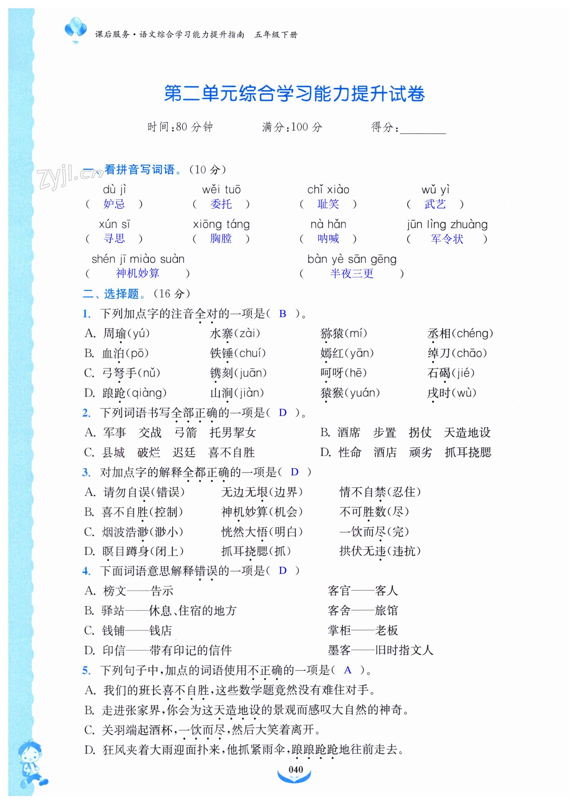 注:目前有些书本章节名称可能整理的还不是很完善,但都是按照顺序排列的,请同学们按照顺序仔细查找。练习册 2024年课后服务综合学习能力提升指南五年级语文下册人教版 答案主要是用来给同学们做完题方便对答案用的,请勿直接抄袭。