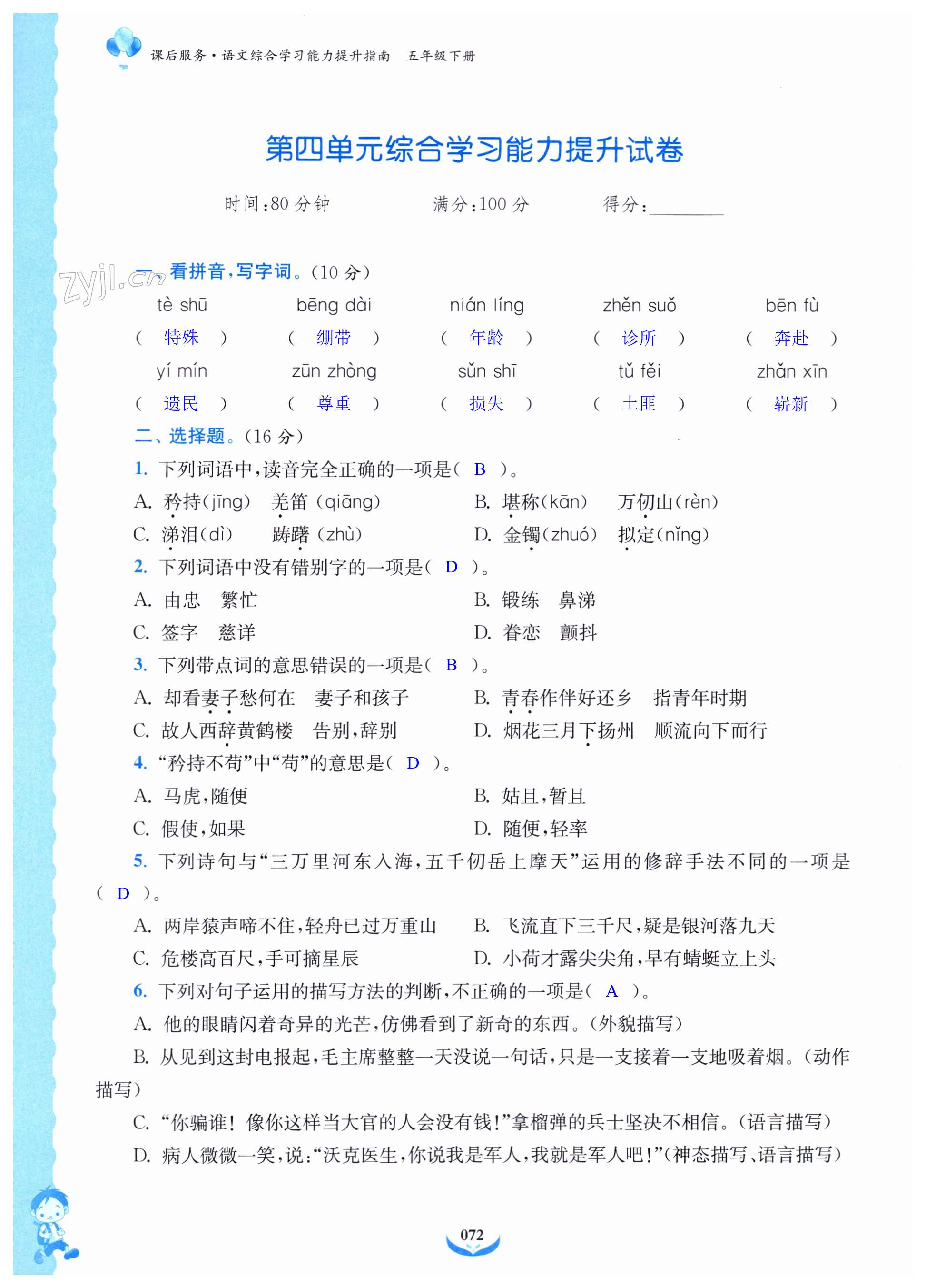 注:目前有些书本章节名称可能整理的还不是很完善,但都是按照顺序排列的,请同学们按照顺序仔细查找。练习册 2024年课后服务综合学习能力提升指南五年级语文下册人教版 答案主要是用来给同学们做完题方便对答案用的,请勿直接抄袭。