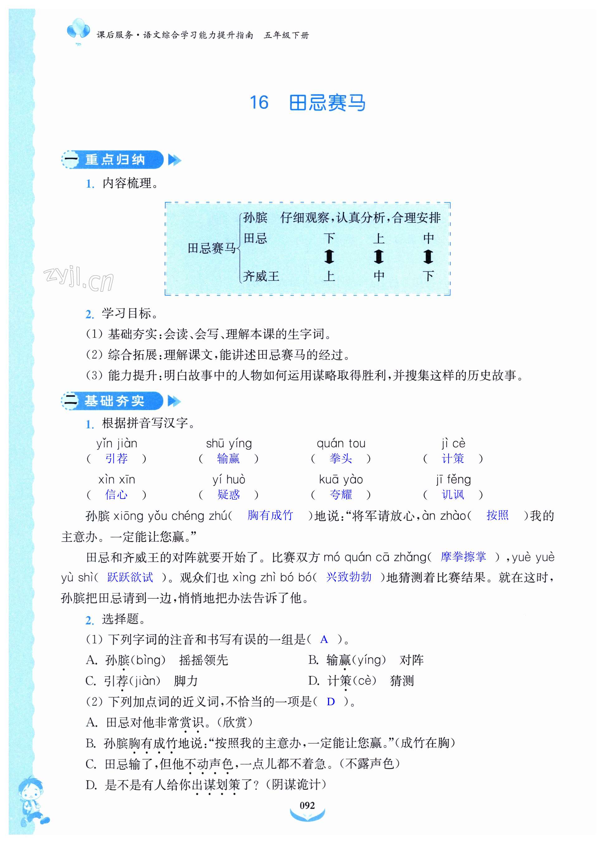 注:目前有些书本章节名称可能整理的还不是很完善,但都是按照顺序排列的,请同学们按照顺序仔细查找。练习册 2024年课后服务综合学习能力提升指南五年级语文下册人教版 答案主要是用来给同学们做完题方便对答案用的,请勿直接抄袭。