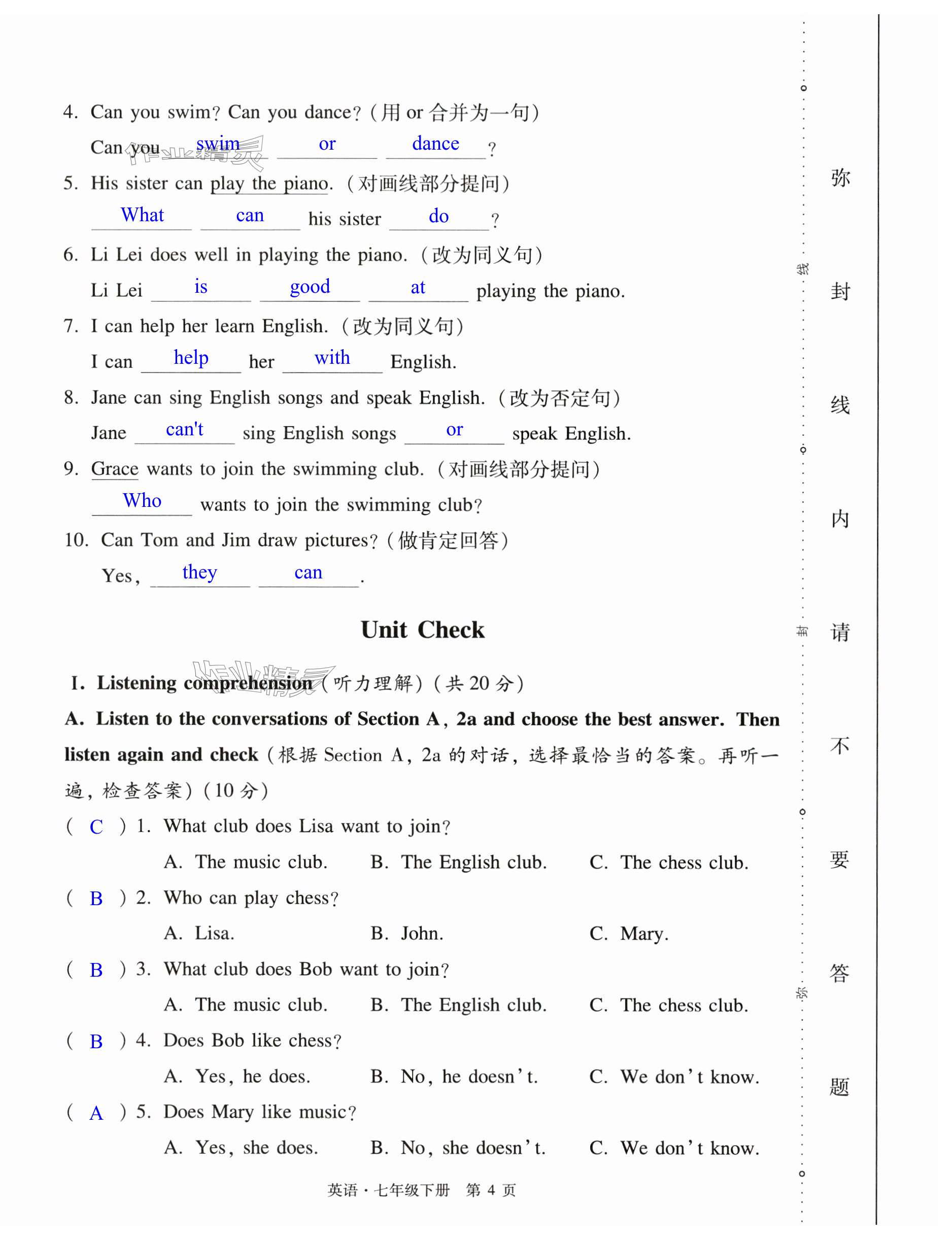 注:目前有些书本章节名称可能整理的还不是很完善,但都是按照顺序排列的,请同学们按照顺序仔细查找。练习册 2024年初中同步练习册自主测试卷七年级英语下册人教版 答案主要是用来给同学们做完题方便对答案用的,请勿直接抄袭。