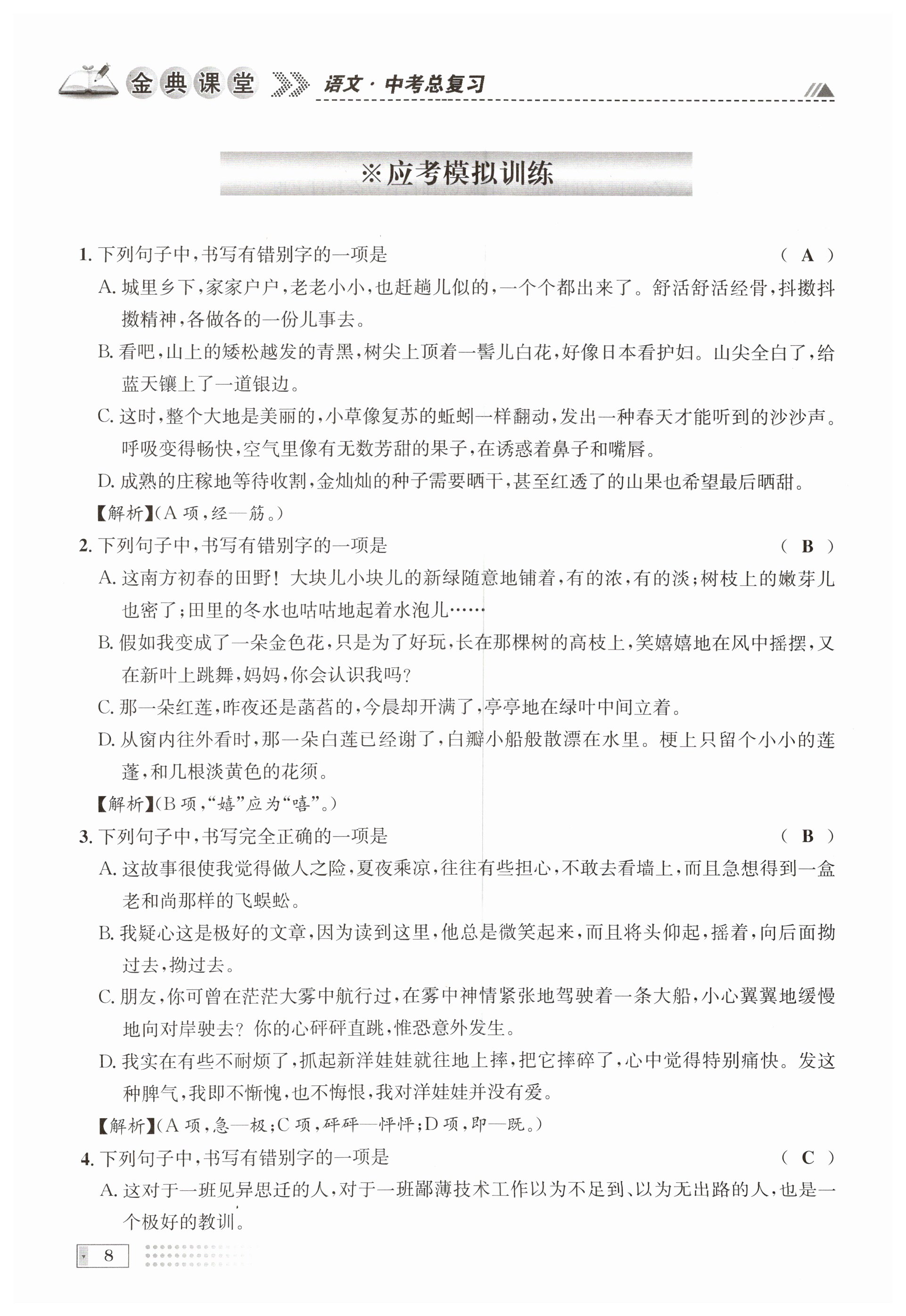 注:目前有些书本章节名称可能整理的还不是很完善,但都是按照顺序排列的,请同学们按照顺序仔细查找。练习册 2024年名校金典课堂中考语文 答案主要是用来给同学们做完题方便对答案用的,请勿直接抄袭。