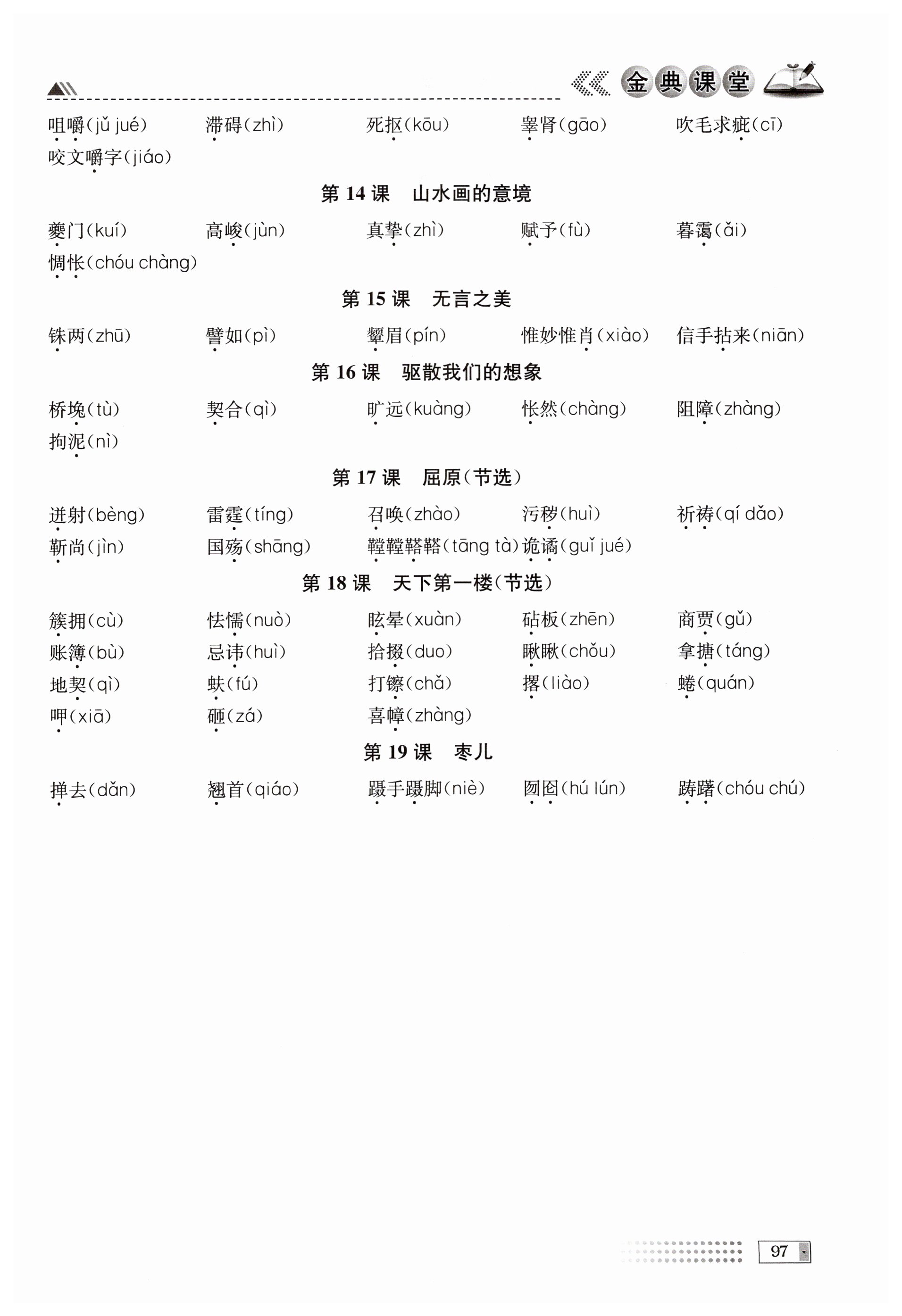 注:目前有些书本章节名称可能整理的还不是很完善,但都是按照顺序排列的,请同学们按照顺序仔细查找。练习册 2024年名校金典课堂中考语文 答案主要是用来给同学们做完题方便对答案用的,请勿直接抄袭。