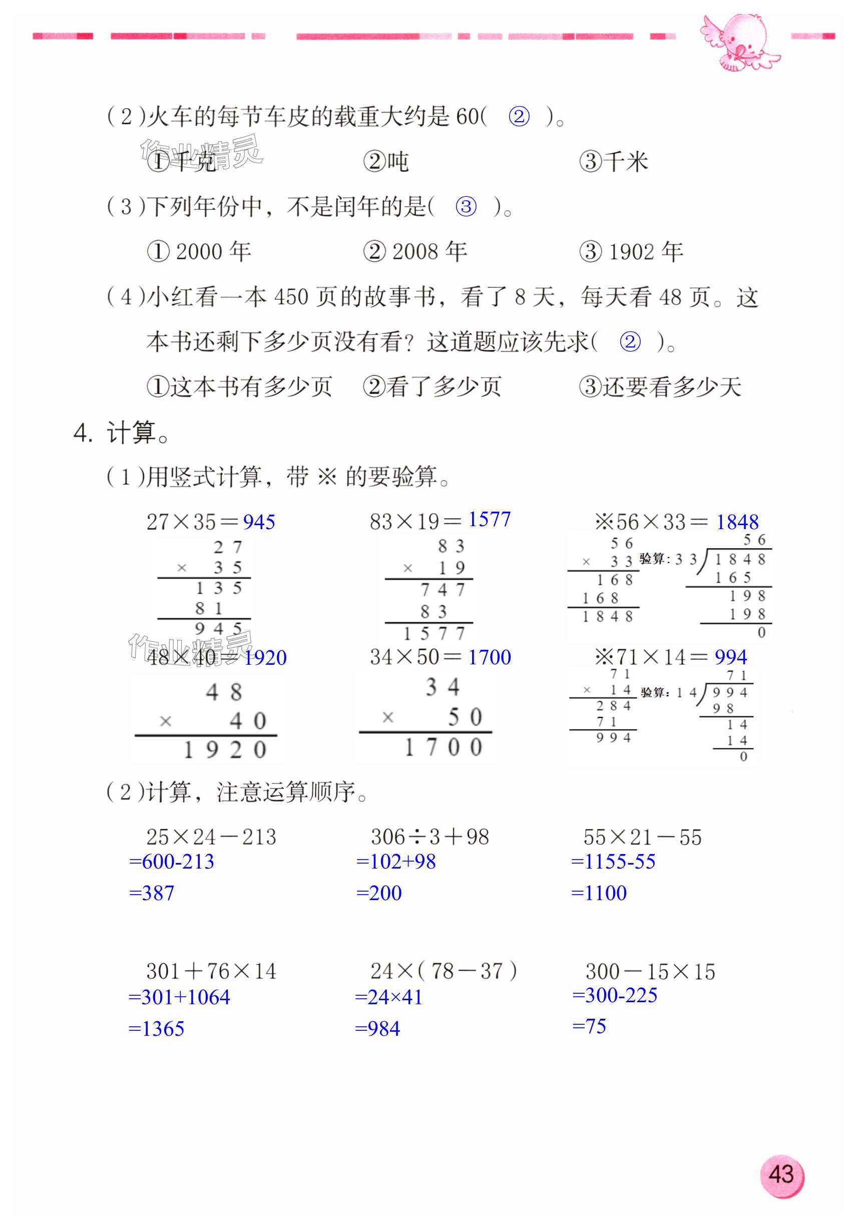 注:目前有些书本章节名称可能整理的还不是很完善,但都是按照顺序排列的,请同学们按照顺序仔细查找。练习册 2024年数学学习与巩固三年级下册苏教版 答案主要是用来给同学们做完题方便对答案用的,请勿直接抄袭。
