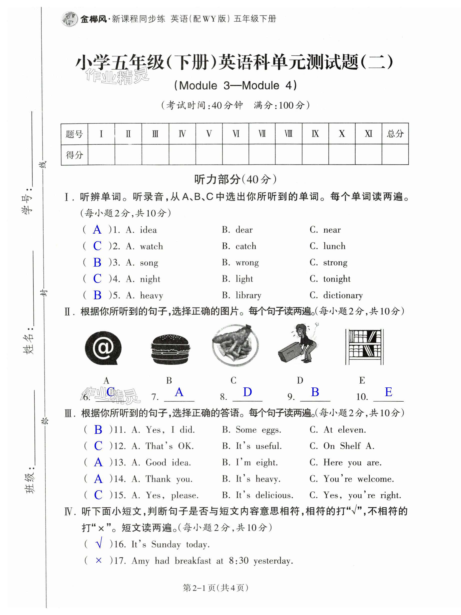 注:目前有些书本章节名称可能整理的还不是很完善,但都是按照顺序排列的,请同学们按照顺序仔细查找。练习册 2024年金椰风新课程同步练五年级英语下册外研版 答案主要是用来给同学们做完题方便对答案用的,请勿直接抄袭。