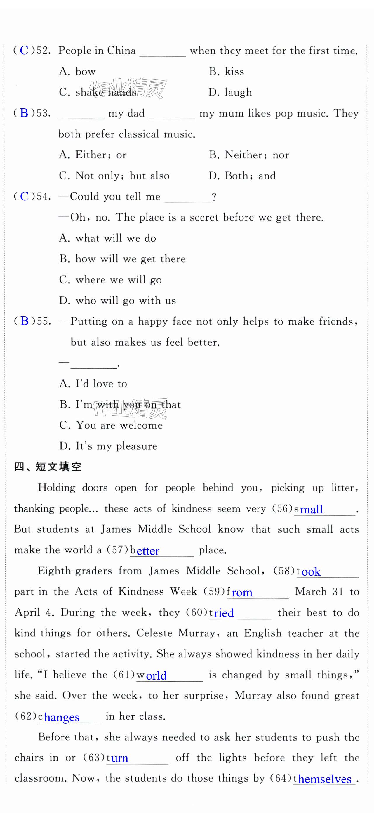 注:目前有些书本章节名称可能整理的还不是很完善,但都是按照顺序排列的,请同学们按照顺序仔细查找。练习册 2024年自我提升与评价九年级英语下册译林版 答案主要是用来给同学们做完题方便对答案用的,请勿直接抄袭。