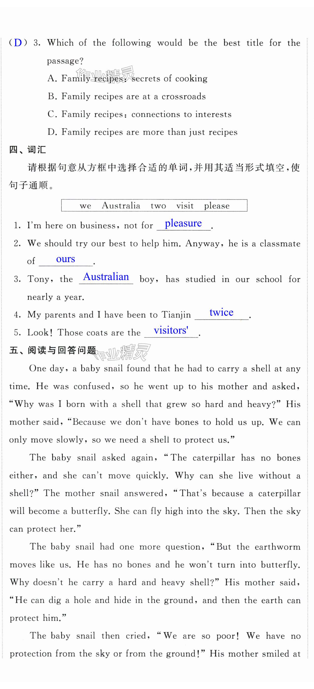 注:目前有些书本章节名称可能整理的还不是很完善,但都是按照顺序排列的,请同学们按照顺序仔细查找。练习册 2024年自我提升与评价八年级英语下册译林版 答案主要是用来给同学们做完题方便对答案用的,请勿直接抄袭。