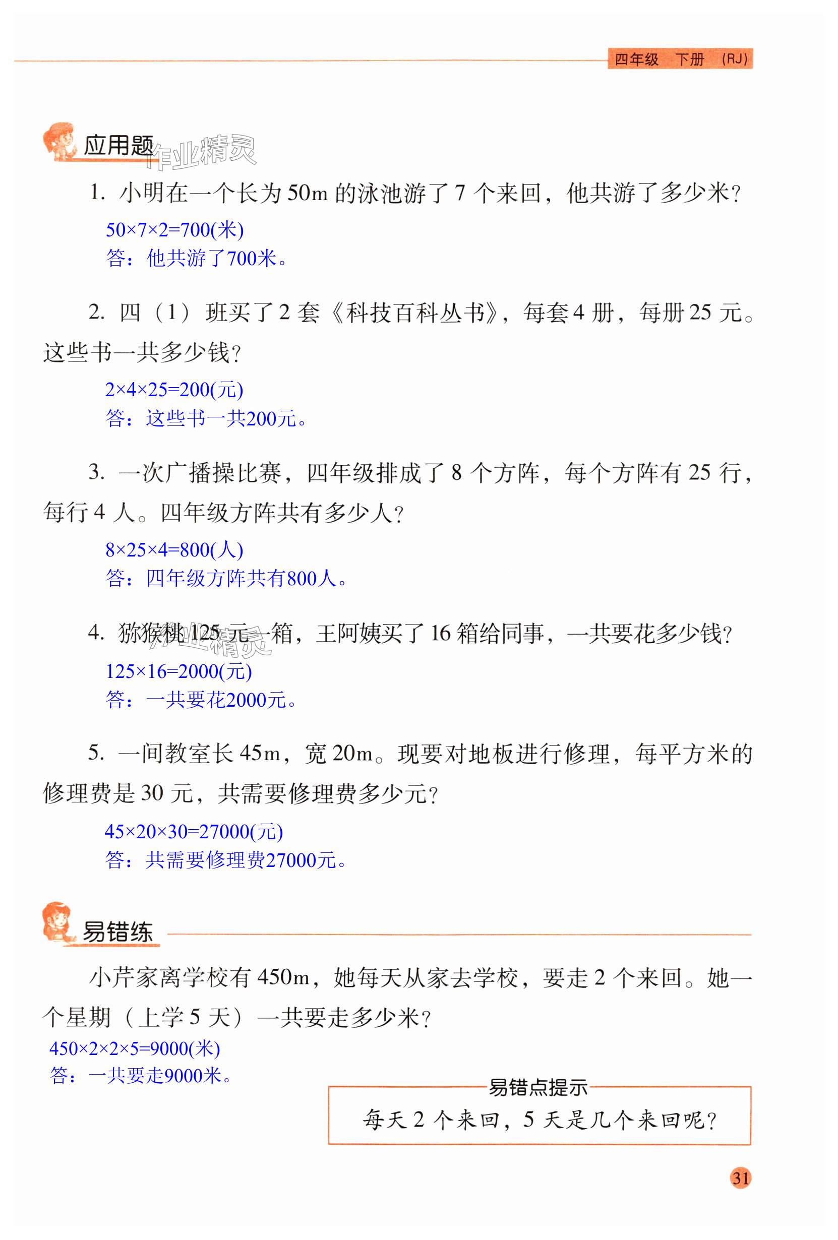 2024年晨光全优口算应用题天天练四年级数学下册人教版