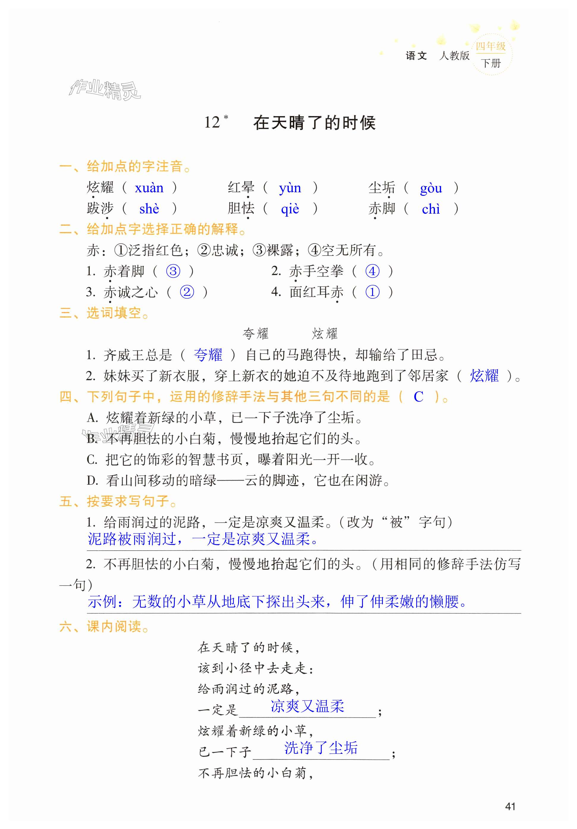 注:目前有些书本章节名称可能整理的还不是很完善,但都是按照顺序排列的,请同学们按照顺序仔细查找。练习册 2024年云南省标准教辅同步指导训练与检测四年级语文下册人教版 答案主要是用来给同学们做完题方便对答案用的,请勿直接抄袭。