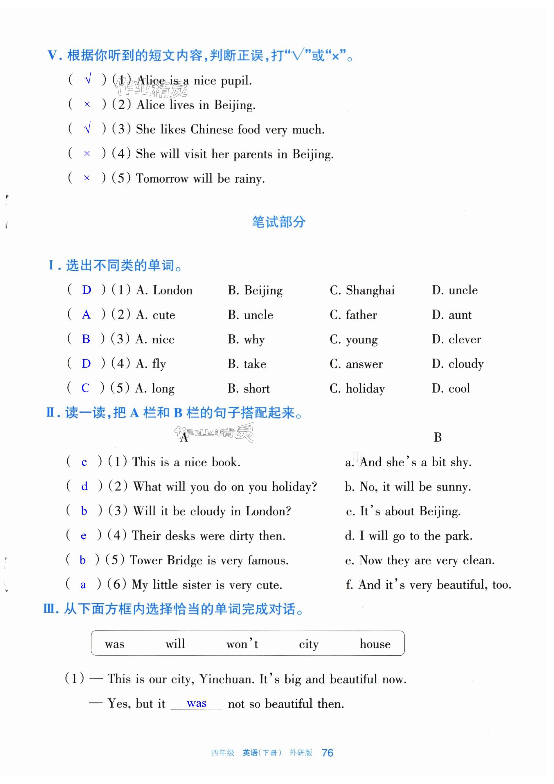 注:目前有些书本章节名称可能整理的还不是很完善,但都是按照顺序排列的,请同学们按照顺序仔细查找。练习册 2024年学习之友四年级英语下册外研版 答案主要是用来给同学们做完题方便对答案用的,请勿直接抄袭。