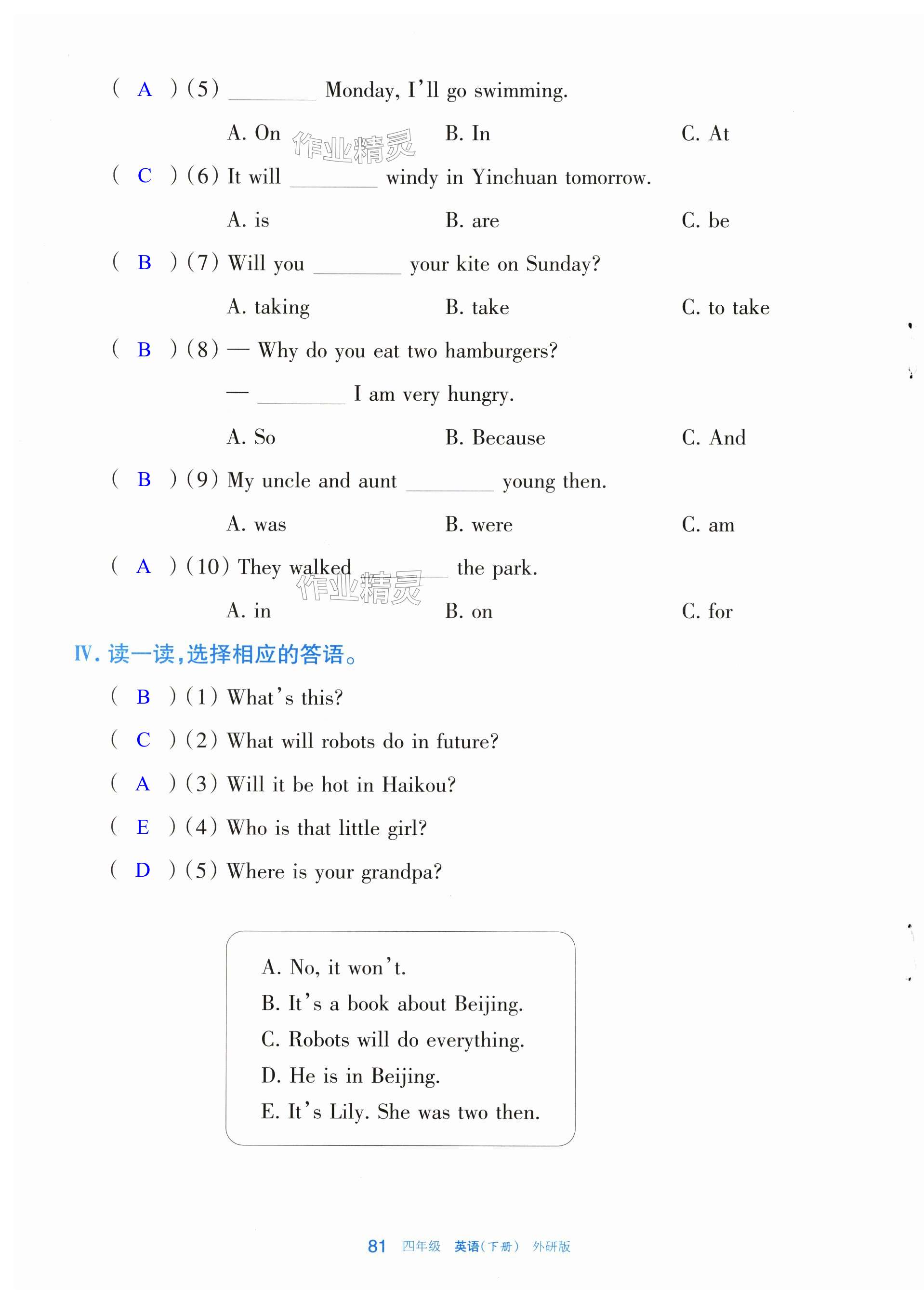 注:目前有些书本章节名称可能整理的还不是很完善,但都是按照顺序排列的,请同学们按照顺序仔细查找。练习册 2024年学习之友四年级英语下册外研版 答案主要是用来给同学们做完题方便对答案用的,请勿直接抄袭。