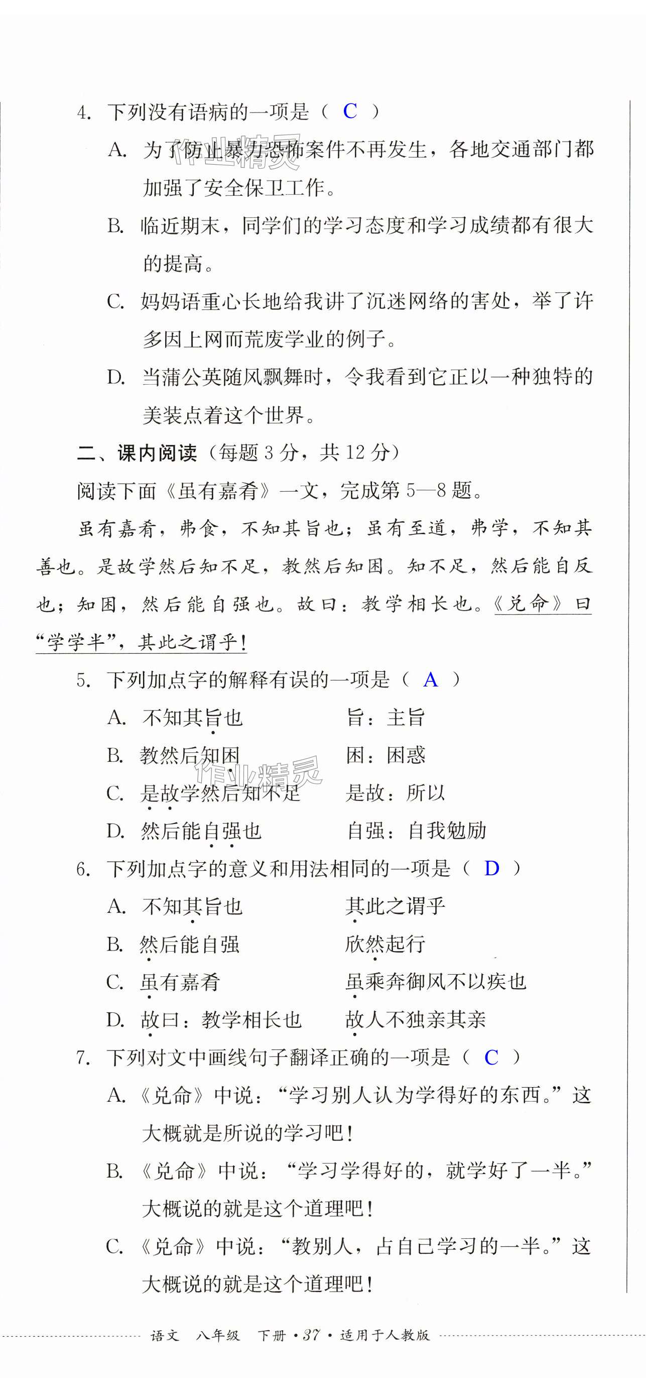 注:目前有些书本章节名称可能整理的还不是很完善,但都是按照顺序排列的,请同学们按照顺序仔细查找。练习册 2024年学情点评四川教育出版社八年级语文下册人教版 答案主要是用来给同学们做完题方便对答案用的,请勿直接抄袭。