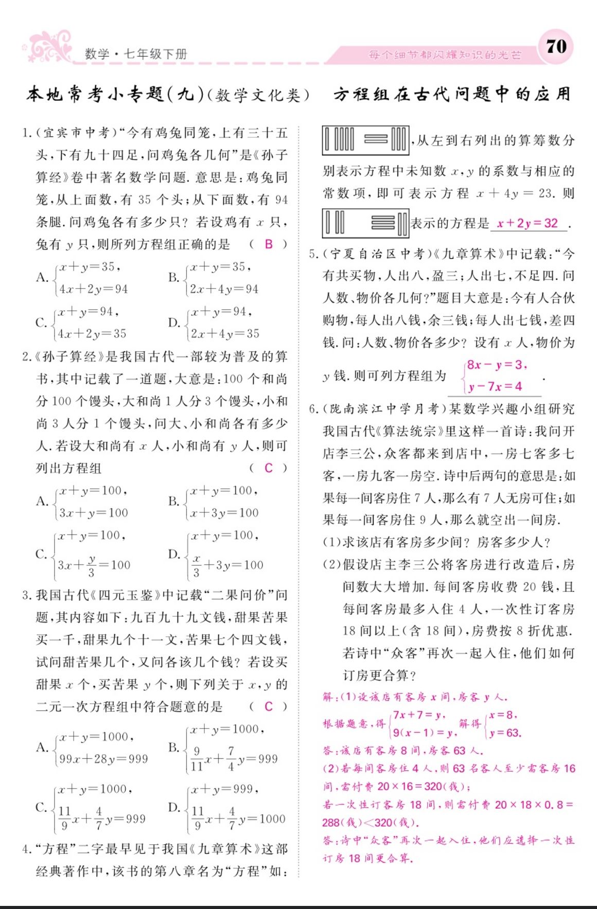 注:目前有些书本章节名称可能整理的还不是很完善,但都是按照顺序排列的,请同学们按照顺序仔细查找。练习册 2024年课堂点睛七年级数学下册人教版宁夏专版 答案主要是用来给同学们做完题方便对答案用的,请勿直接抄袭。