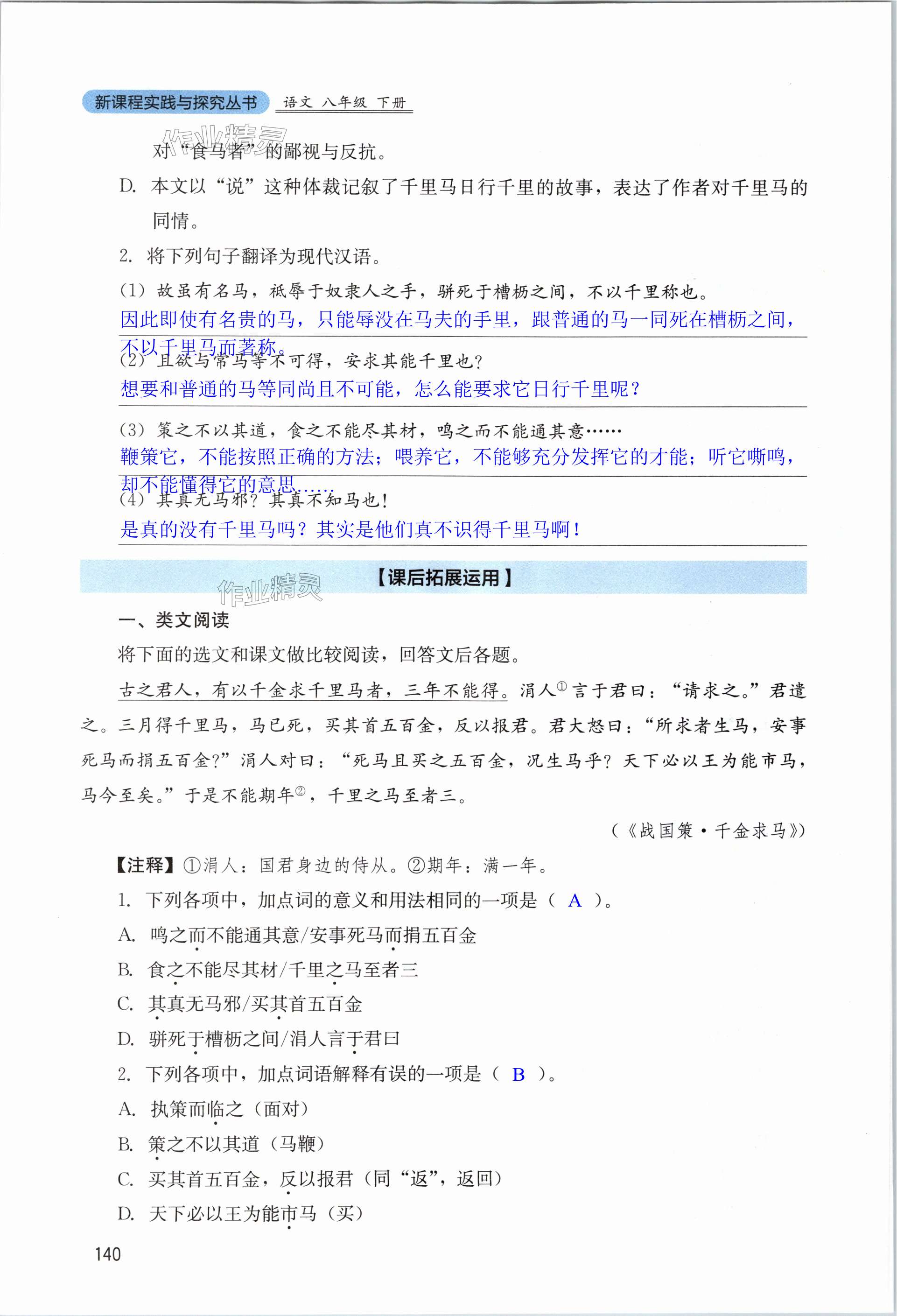注:目前有些书本章节名称可能整理的还不是很完善,但都是按照顺序排列的,请同学们按照顺序仔细查找。练习册 2024年新课程实践与探究丛书八年级语文下册人教版 答案主要是用来给同学们做完题方便对答案用的,请勿直接抄袭。