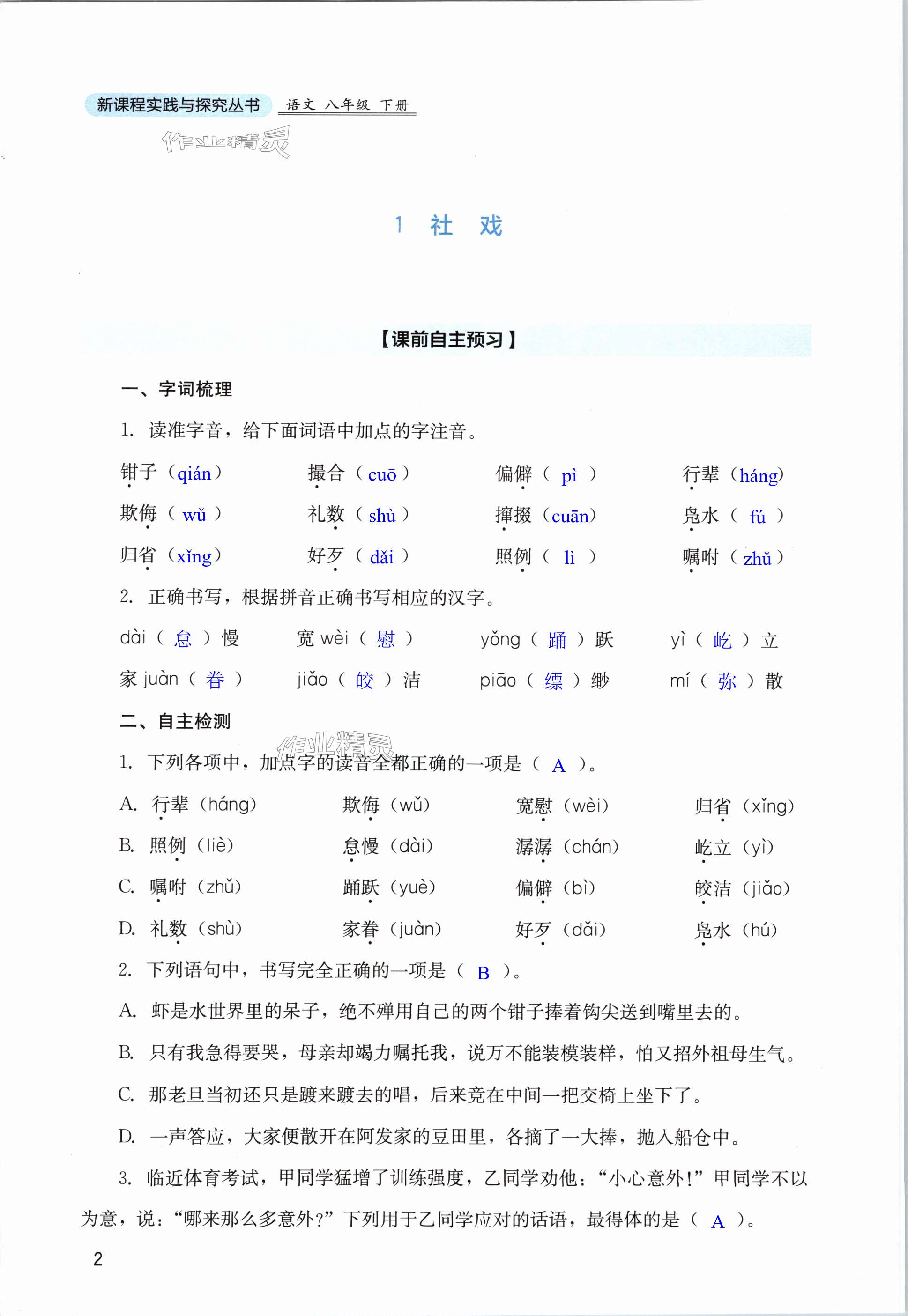 注:目前有些书本章节名称可能整理的还不是很完善,但都是按照顺序排列的,请同学们按照顺序仔细查找。练习册 2024年新课程实践与探究丛书八年级语文下册人教版 答案主要是用来给同学们做完题方便对答案用的,请勿直接抄袭。