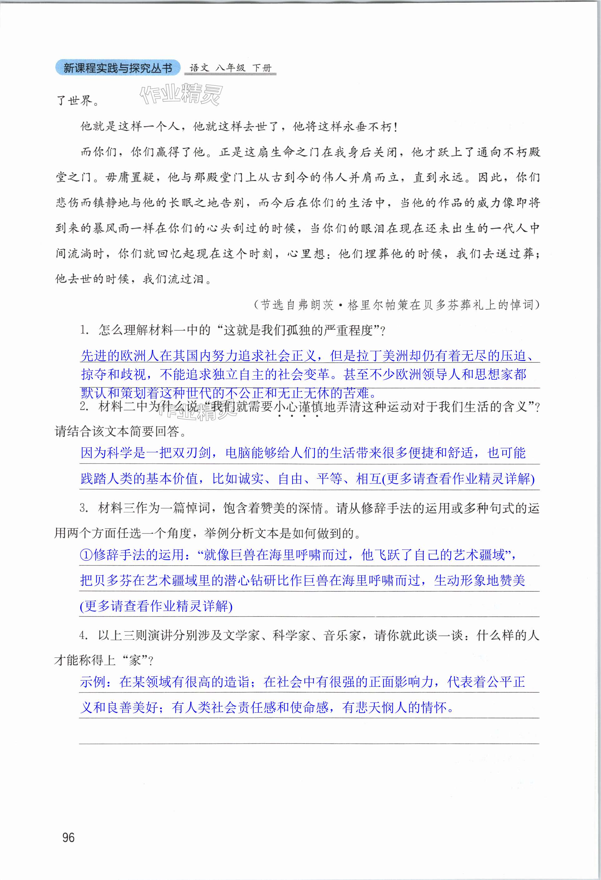 注:目前有些书本章节名称可能整理的还不是很完善,但都是按照顺序排列的,请同学们按照顺序仔细查找。练习册 2024年新课程实践与探究丛书八年级语文下册人教版 答案主要是用来给同学们做完题方便对答案用的,请勿直接抄袭。