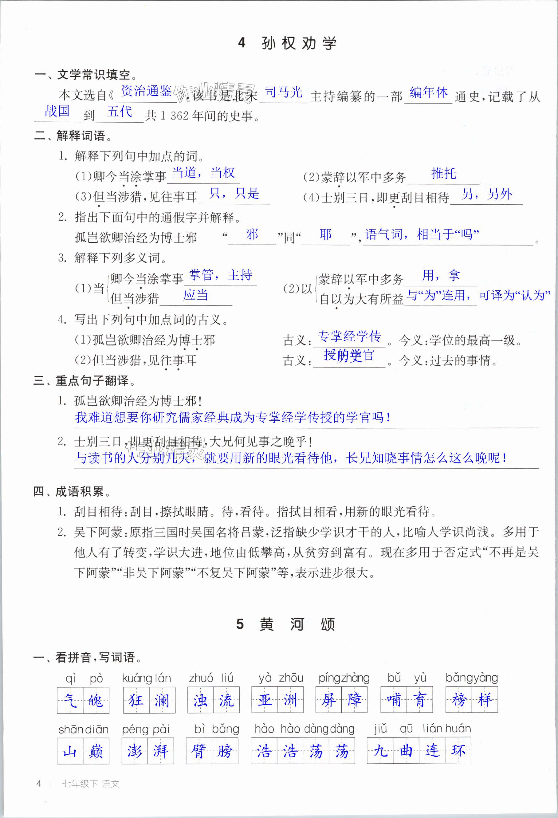 注:目前有些书本章节名称可能整理的还不是很完善,但都是按照顺序排列的,请同学们按照顺序仔细查找。练习册 2024年课时训练七年级语文下册人教版江苏人民出版社 答案主要是用来给同学们做完题方便对答案用的,请勿直接抄袭。